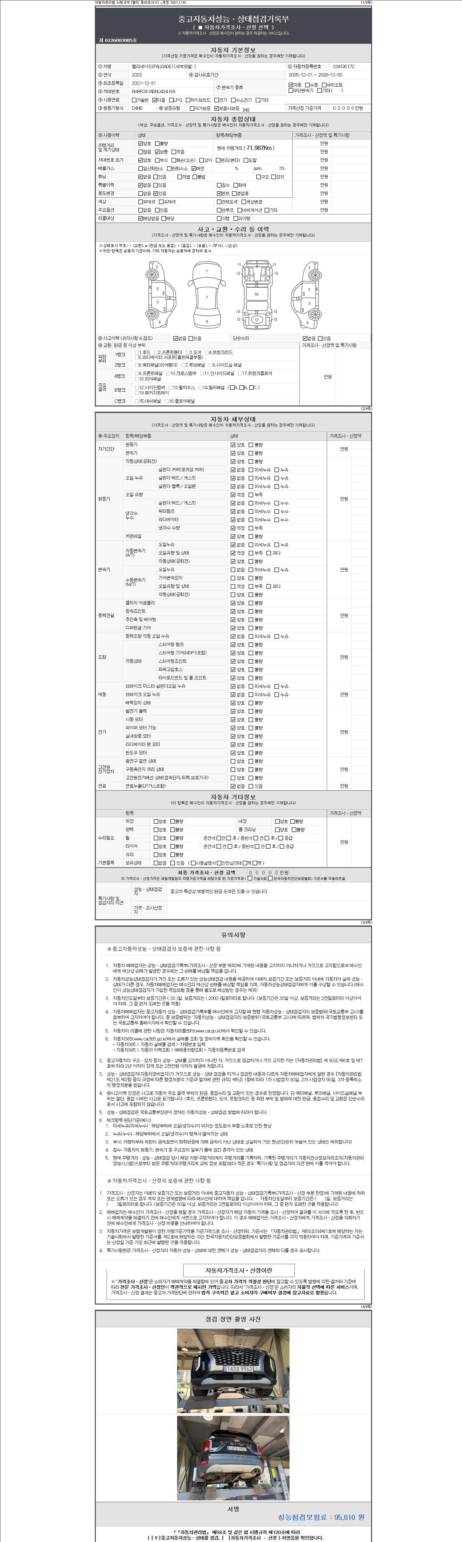자동차관리법 시행규칙 제120조의 규정에 따라 별지 제 82호서식 《중고자동차 성능, 상태점검 기록부》를 발행한 성능, 상태점검자 및 매매자는 아래의 보증기간 또는 보증거리 이내의 중고자동차, 성능점검 기록부에 기재된 내용과 자동차의 실제 성능, 상태가 다른 경우 계약 또는 관계법령에 따라 매수인에 대하여 책임을 집니다.