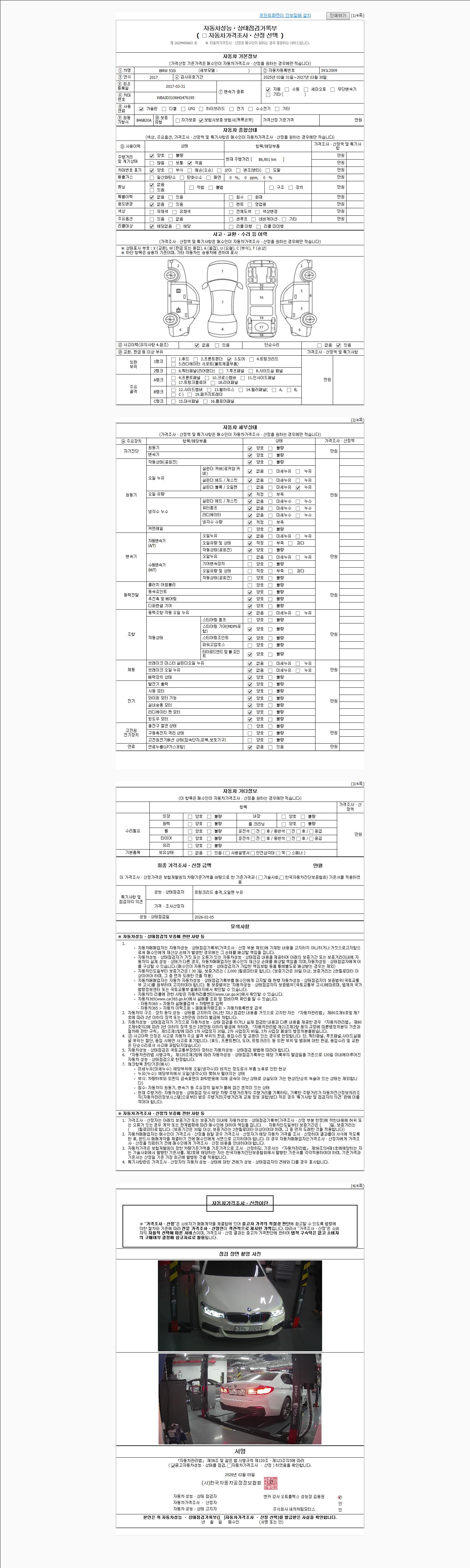 자동차관리법 시행규칙 제120조의 규정에 따라 별지 제 82호서식 《중고자동차 성능, 상태점검 기록부》를 발행한 성능, 상태점검자 및 매매자는 아래의 보증기간 또는 보증거리 이내의 중고자동차, 성능점검 기록부에 기재된 내용과 자동차의 실제 성능, 상태가 다른 경우 계약 또는 관계법령에 따라 매수인에 대하여 책임을 집니다.