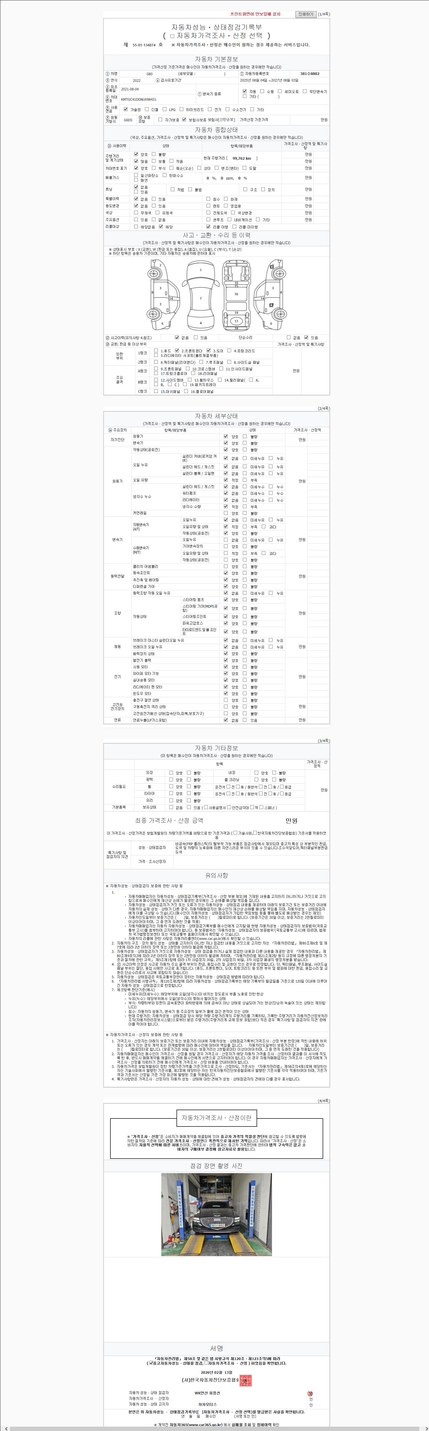 자동차관리법 시행규칙 제120조의 규정에 따라 별지 제 82호서식 《중고자동차 성능, 상태점검 기록부》를 발행한 성능, 상태점검자 및 매매자는 아래의 보증기간 또는 보증거리 이내의 중고자동차, 성능점검 기록부에 기재된 내용과 자동차의 실제 성능, 상태가 다른 경우 계약 또는 관계법령에 따라 매수인에 대하여 책임을 집니다.