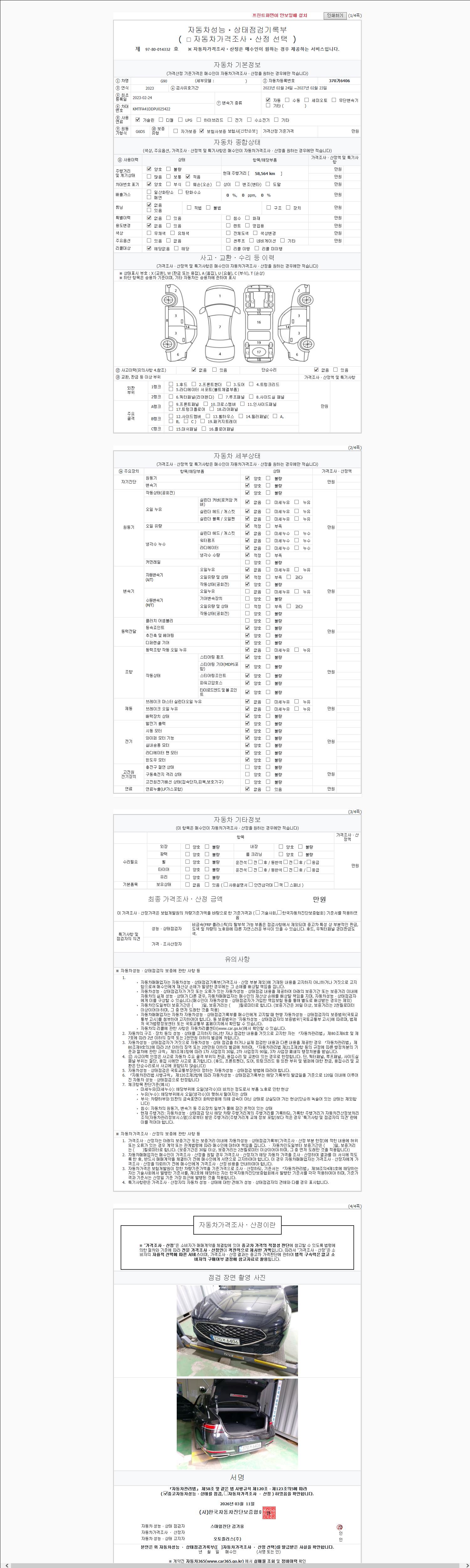 | 주행거리 | 58,564 km | 차량번호 | 370거6406 | 사고유무 | 성능기록부 참조 | 제시번호 | 제 2026007768 호 |