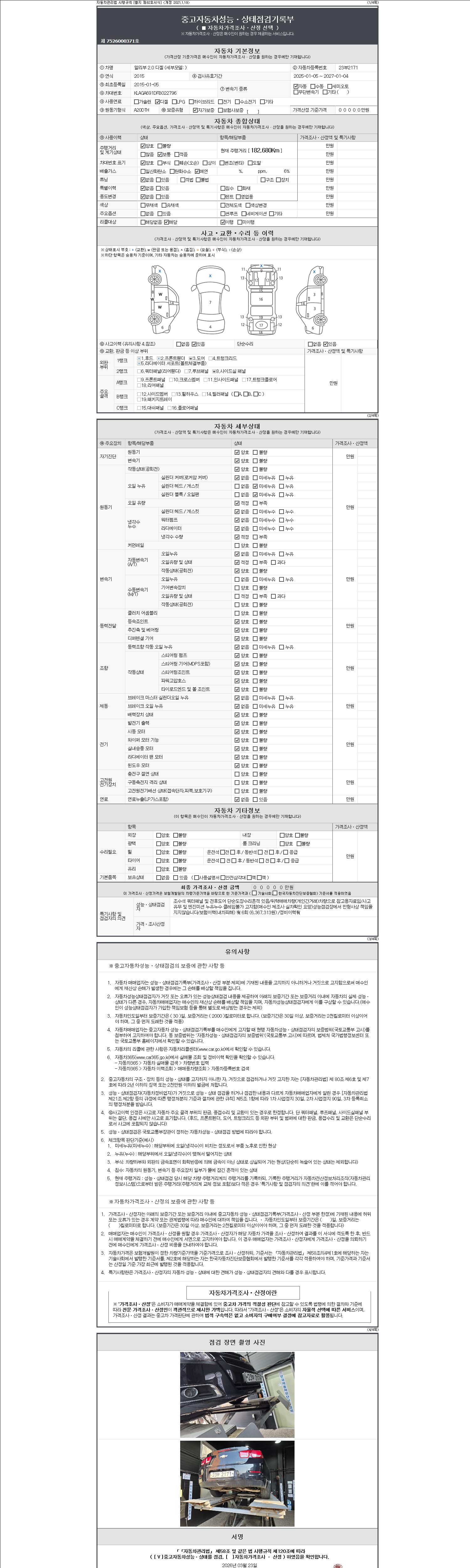 - 2. 차량 등록증이나 성능점검지 등을 상담자에게 요청및 확인하시고 사전에 미리 점검 하시기를 권유드립니다.