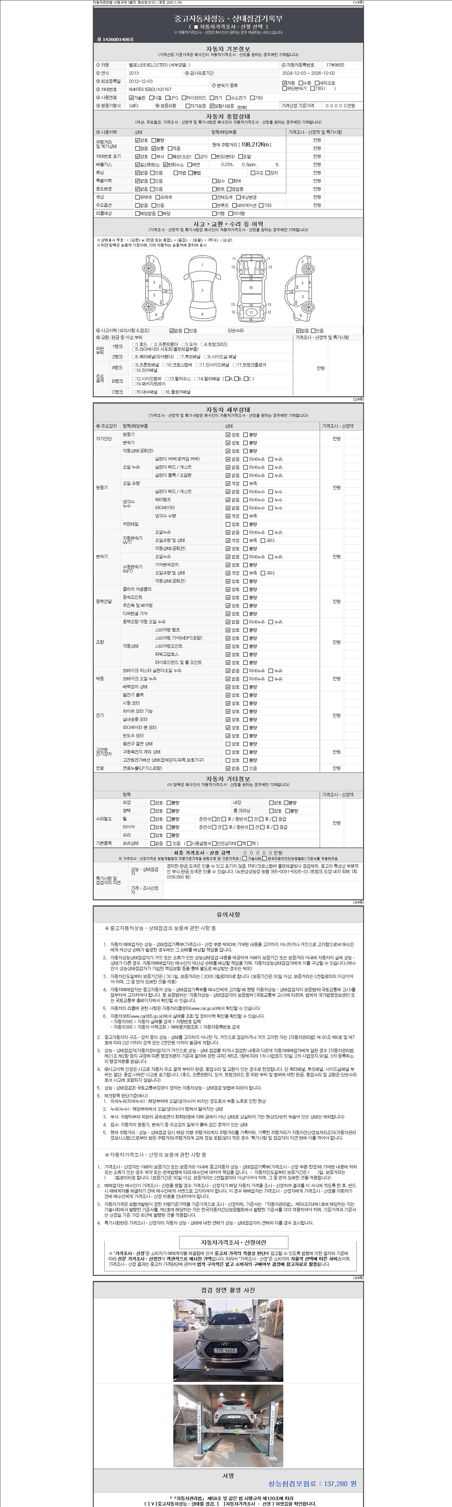 -중고자동차 매매업자를 통해 차량을 구입하실 경우 반드시 "중고자동차 성능, 상태점검 기록부"를 교뷰 받으셔야 하며, 매매업자는 반드시 의무 교부 하여야 압니다.