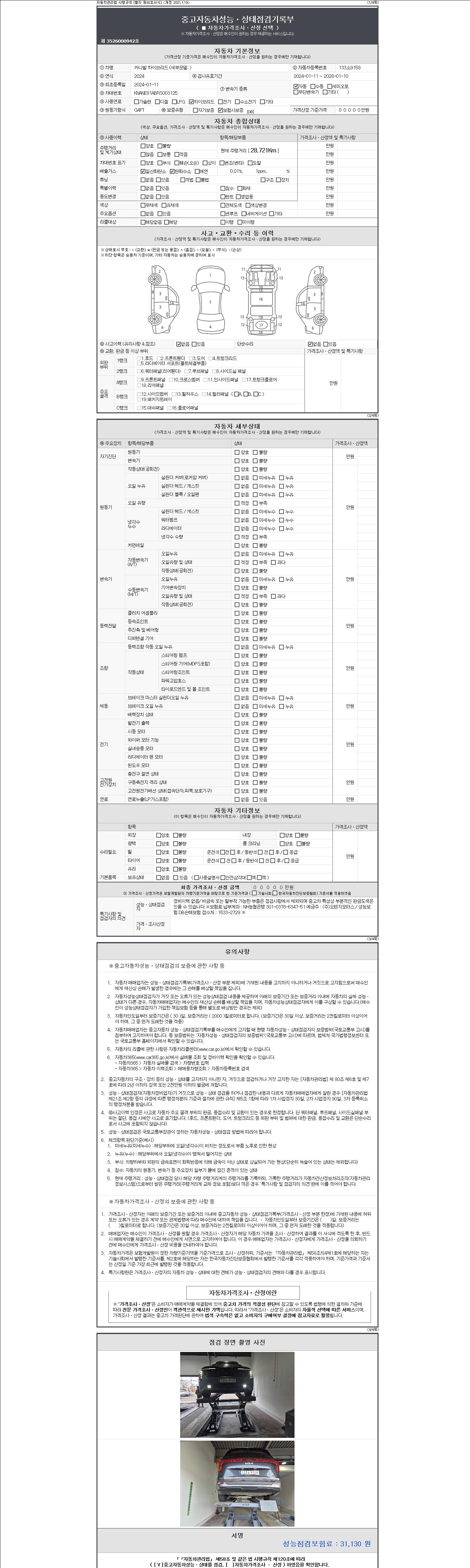 자동차관리법 시행규칙 제120조의 규정에 따라 별지 제 82호서식 《중고자동차 성능, 상태점검 기록부》를 발행한 성능, 상태점검자 및 매매자는 아래의 보증기간 또는 보증거리 이내의 중고자동차, 성능점검 기록부에 기재된 내용과 자동차의 실제 성능, 상태가 다른 경우 계약 또는 관계법령에 따라 매수인에 대하여 책임을 집니다.
