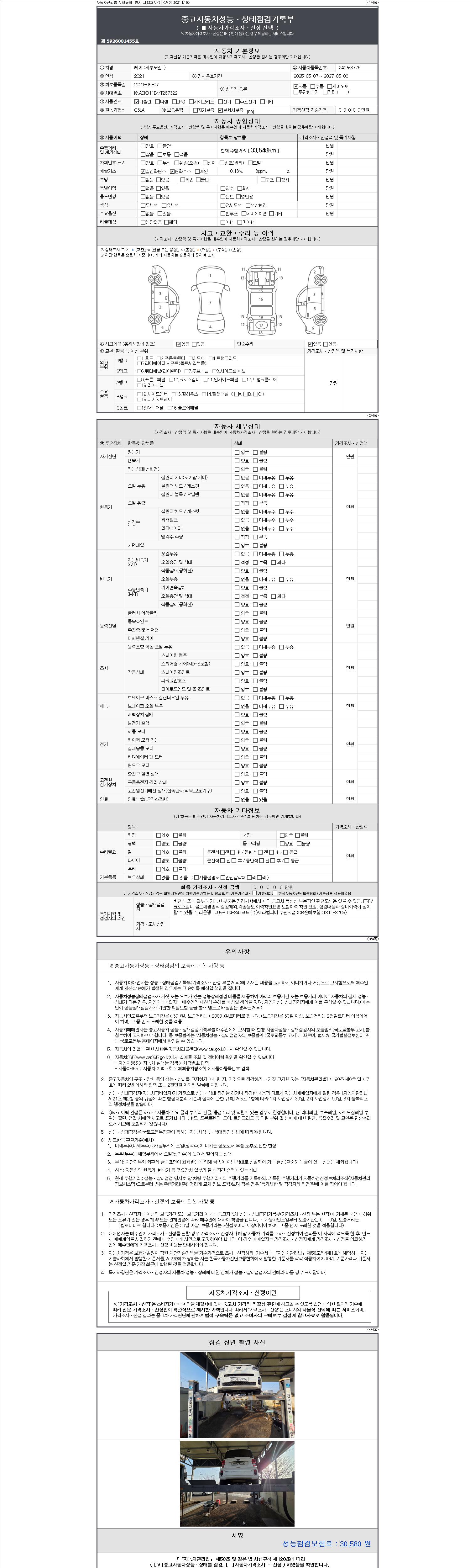 자동차관리법 시행규칙 제120조의 규정에 따라 별지 제 82호서식 《중고자동차 성능, 상태점검 기록부》를 발행한 성능, 상태점검자 및 매매자는 아래의 보증기간 또는 보증거리 이내의 중고자동차, 성능점검 기록부에 기재된 내용과 자동차의 실제 성능, 상태가 다른 경우 계약 또는 관계법령에 따라 매수인에 대하여 책임을 집니다.