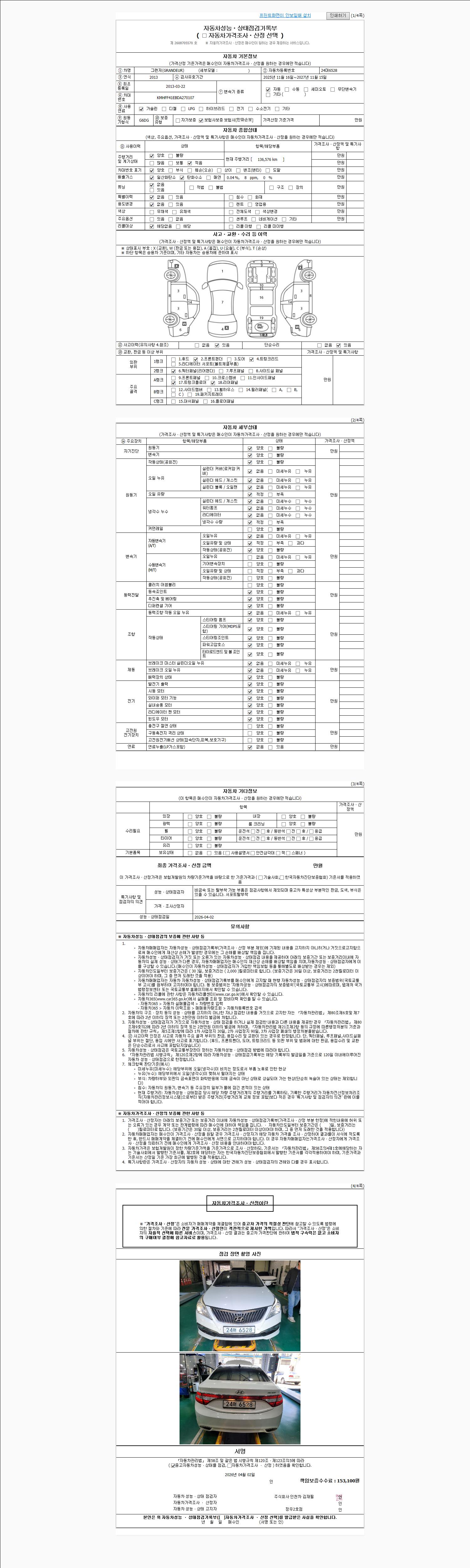 | 주행거리 | 136,576 km | 차량번호 | 24머6528 | 사고유무 | 성능기록부 참조 | 제시번호 | 제 2026016761 호 |