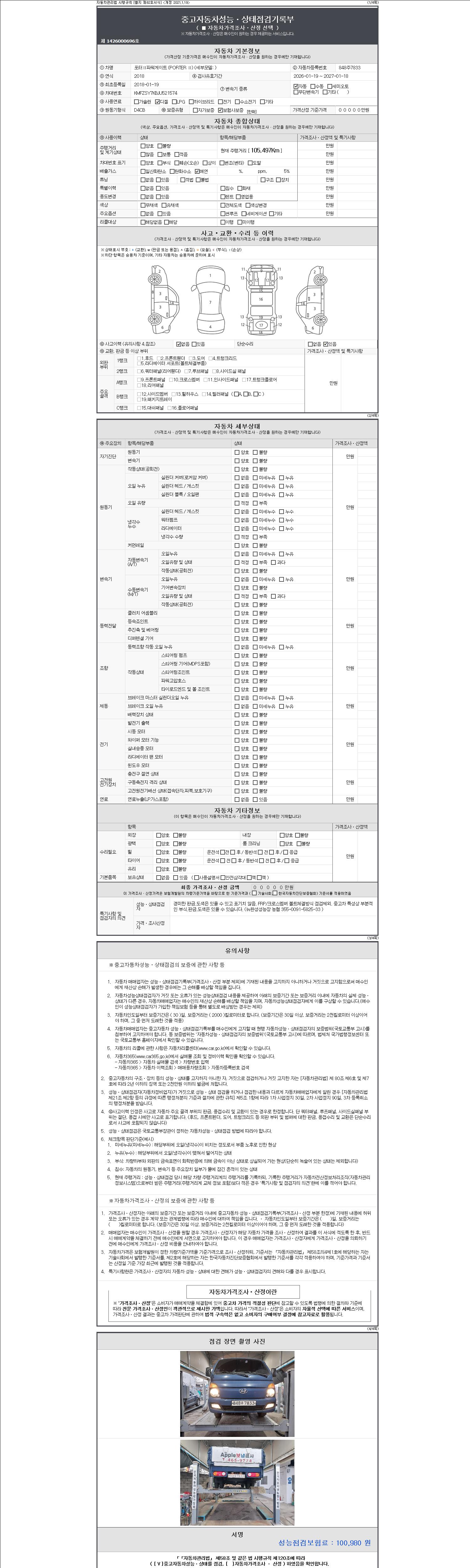 자동차관리법 시행규칙 제120조의 규정에 따라 별지 제 82호서식 《중고자동차 성능, 상태점검 기록부》를 발행한 성능, 상태점검자 및 매매자는 아래의 보증기간 또는 보증거리 이내의 중고자동차, 성능점검 기록부에 기재된 내용과 자동차의 실제 성능, 상태가 다른 경우 계약 또는 관계법령에 따라 매수인에 대하여 책임을 집니다.