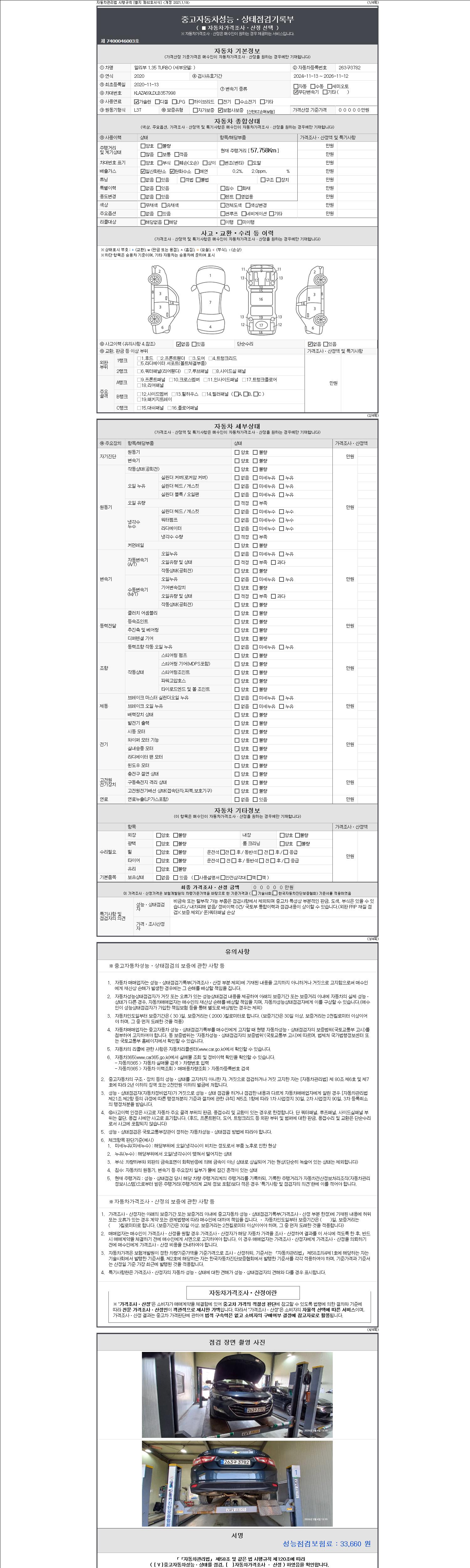 자동차관리법 시행규칙 제120조의 규정에 따라 별지 제 82호서식 《중고자동차 성능, 상태점검 기록부》를 발행한 성능, 상태점검자 및 매매자는 아래의 보증기간 또는 보증거리 이내의 중고자동차, 성능점검 기록부에 기재된 내용과 자동차의 실제 성능, 상태가 다른 경우 계약 또는 관계법령에 따라 매수인에 대하여 책임을 집니다.
