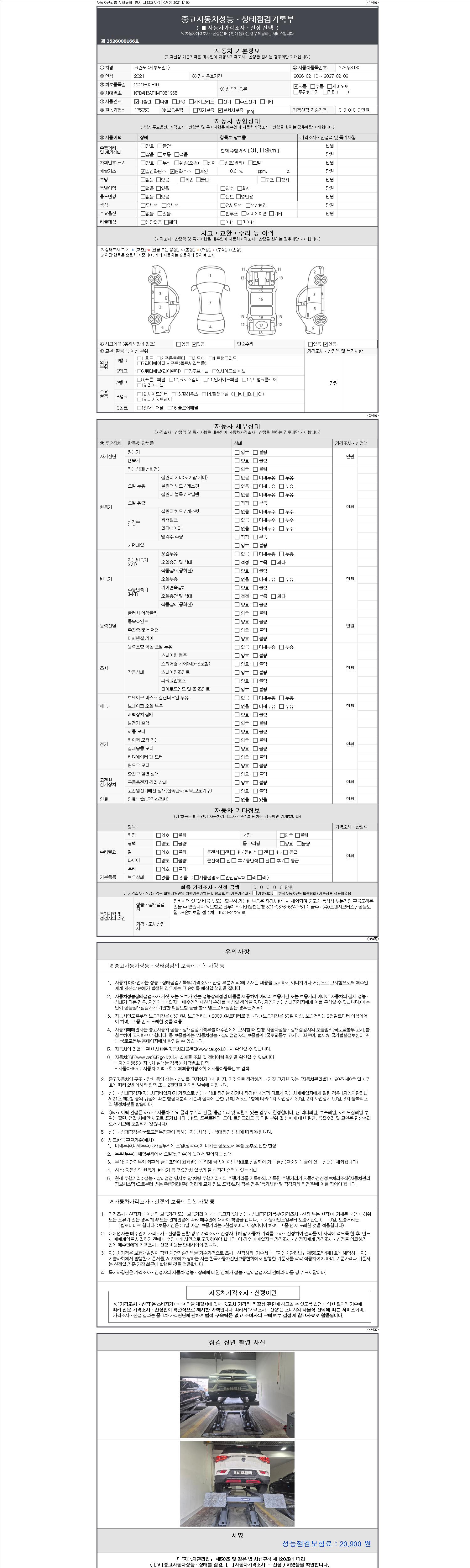 자동차관리법 시행규칙 제120조의 규정에 따라 별지 제 82호서식 《중고자동차 성능, 상태점검 기록부》를 발행한 성능, 상태점검자 및 매매자는 아래의 보증기간 또는 보증거리 이내의 중고자동차, 성능점검 기록부에 기재된 내용과 자동차의 실제 성능, 상태가 다른 경우 계약 또는 관계법령에 따라 매수인에 대하여 책임을 집니다.
