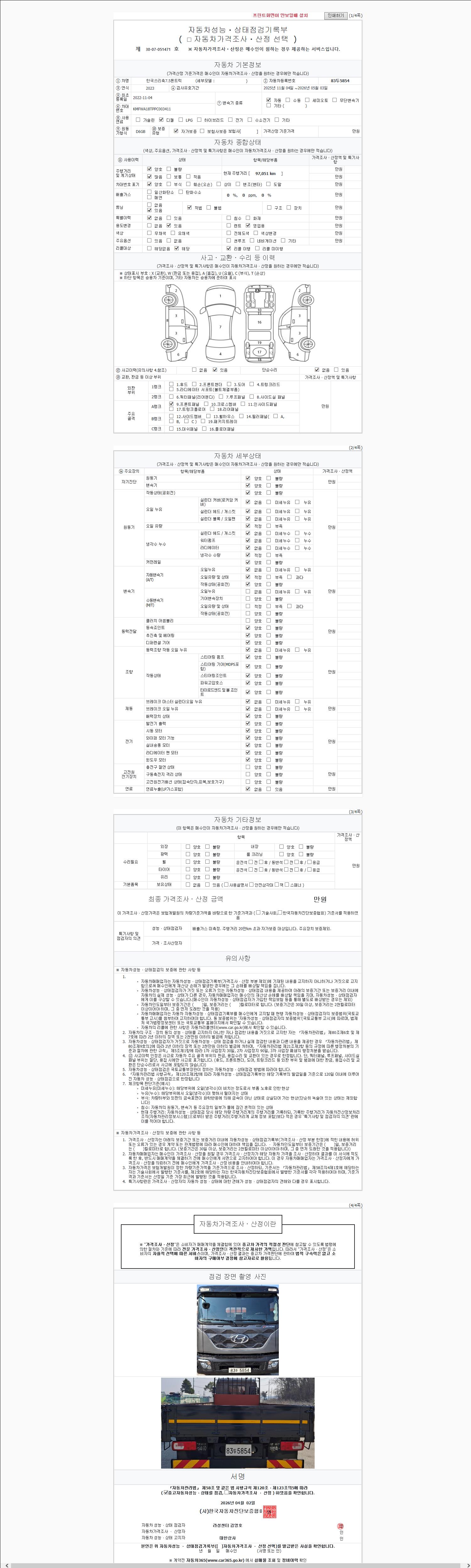 | 주행거리 | 97,050 km | 차량번호 | 83두5854 | 사고유무 | 성능기록부 참조 | 제시번호 | 제 2147483647 호 |