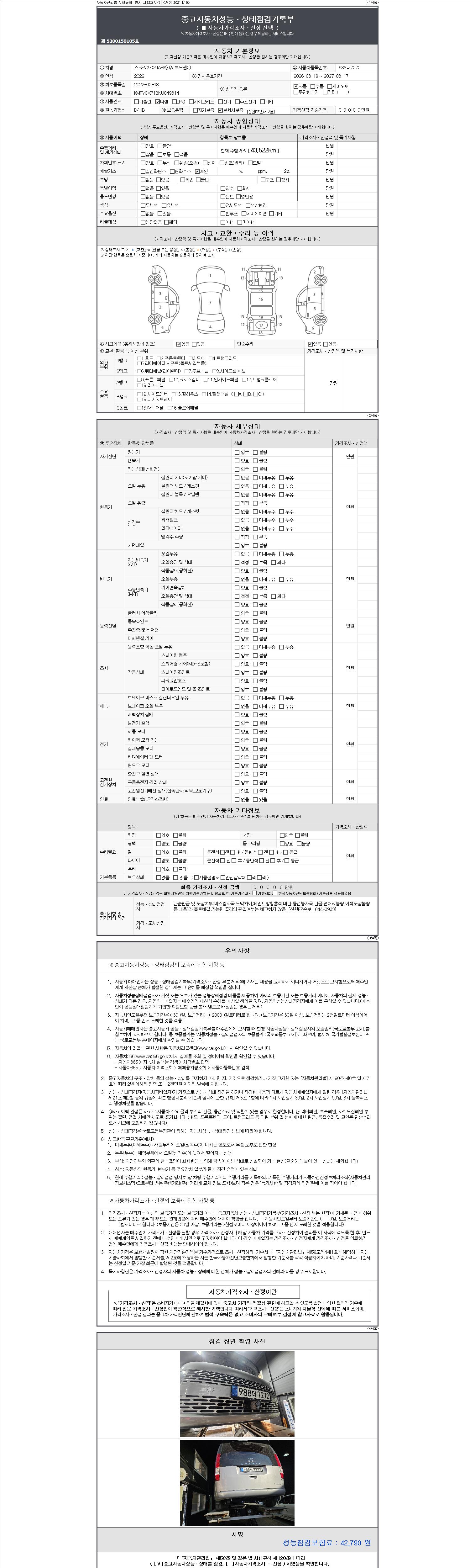 자동차관리법 시행규칙 제120조의 규정에 따라 별지 제 82호서식 《중고자동차 성능, 상태점검 기록부》를 발행한 성능, 상태점검자 및 매매자는 아래의 보증기간 또는 보증거리 이내의 중고자동차, 성능점검 기록부에 기재된 내용과 자동차의 실제 성능, 상태가 다른 경우 계약 또는 관계법령에 따라 매수인에 대하여 책임을 집니다.