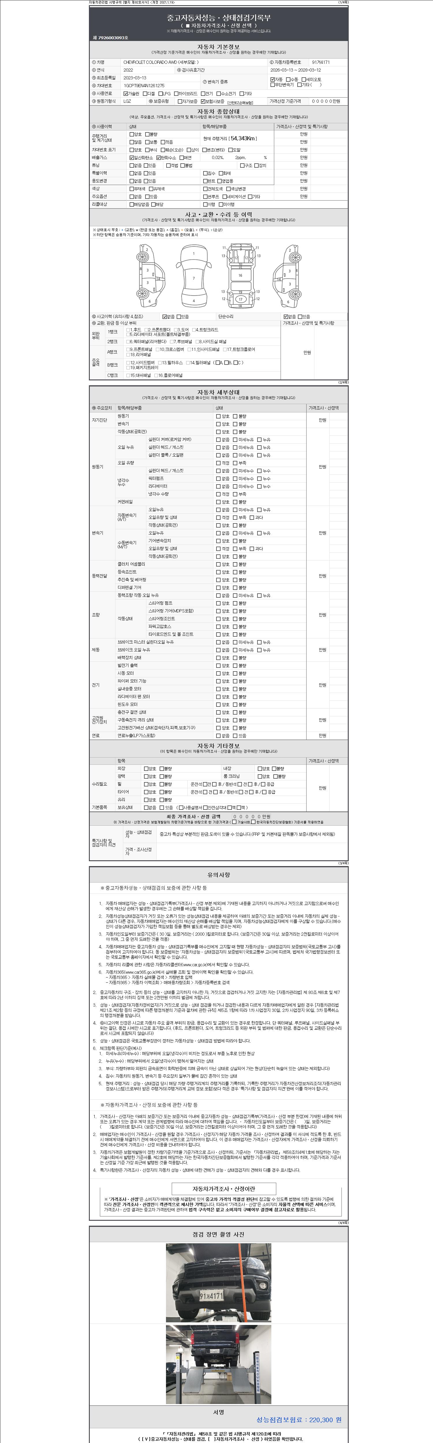 | 주행거리 | 54,343 km | 차량번호 | 91거4171 | 사고유무 | 성능기록부 참조 | 제시번호 | 제 2147483647 호 |