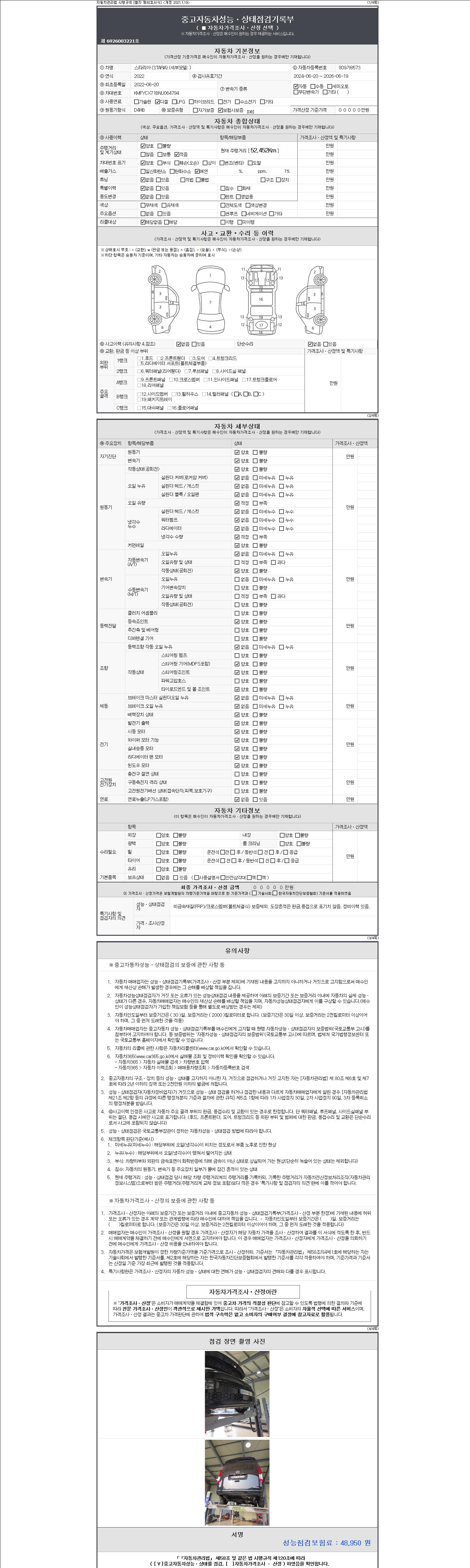 자동차관리법 시행규칙 제120조의 규정에 따라 별지 제 82호서식 《중고자동차 성능, 상태점검 기록부》를 발행한 성능, 상태점검자 및 매매자는 아래의 보증기간 또는 보증거리 이내의 중고자동차, 성능점검 기록부에 기재된 내용과 자동차의 실제 성능, 상태가 다른 경우 계약 또는 관계법령에 따라 매수인에 대하여 책임을 집니다.