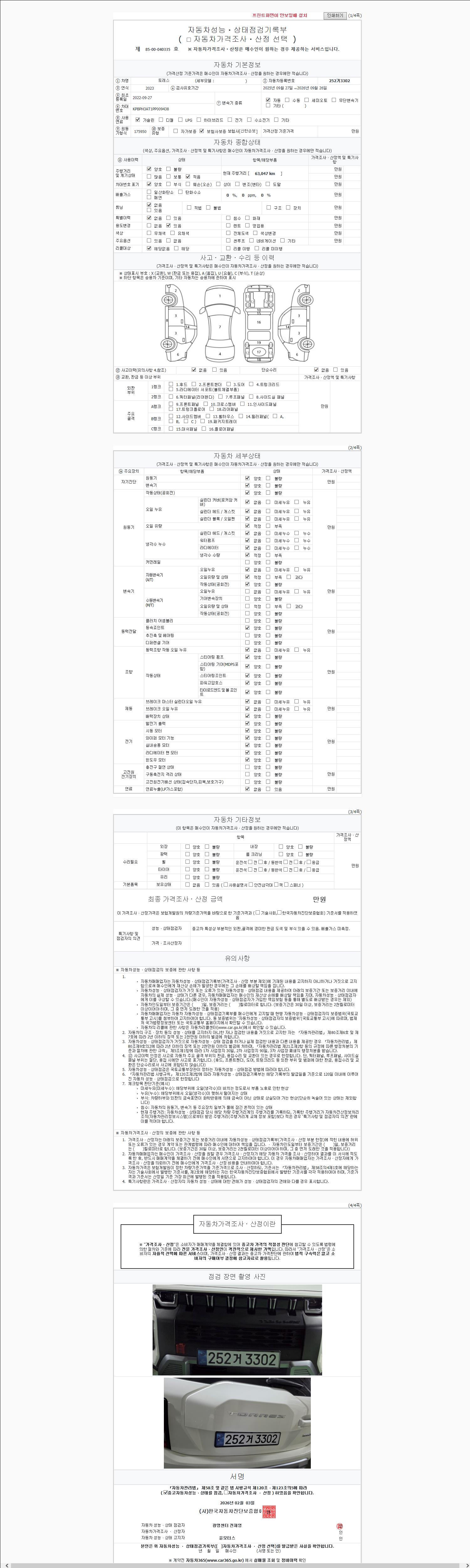 | 주행거리 | 63,047 km | 차량번호 | 252거3302 | 사고유무 | 성능기록부 참조 | 제시번호 | 제 2147483647 호 |
