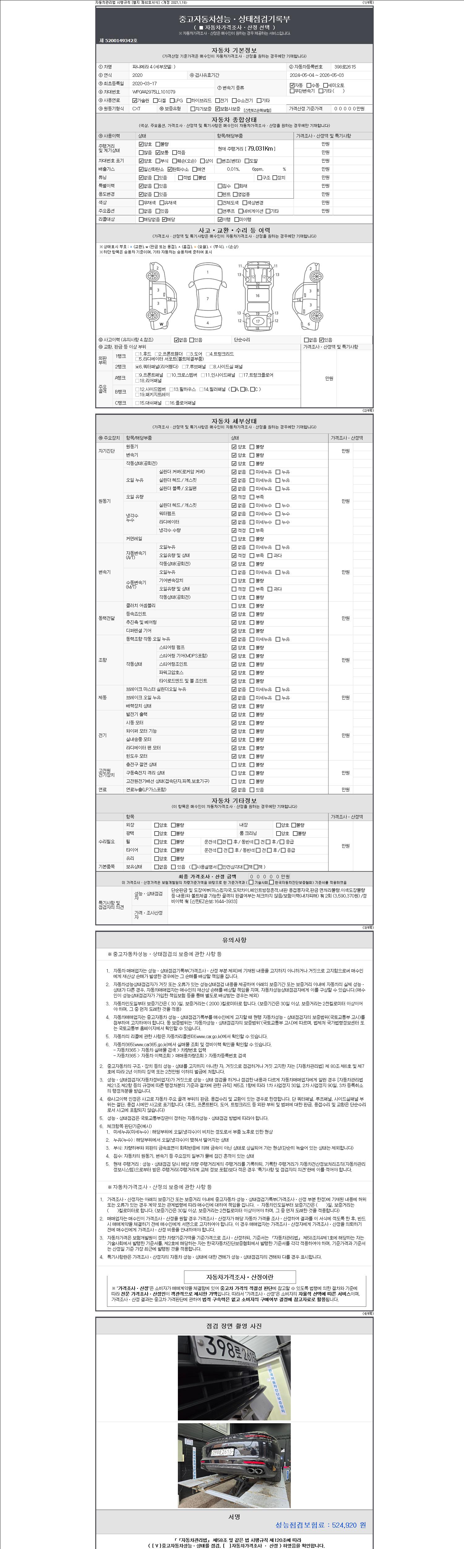 | 주행거리 | 79,031 km | 차량번호 | 398로2615 | 사고유무 | 성능기록부 참조 | 제시번호 | 제 2147483647 호 |