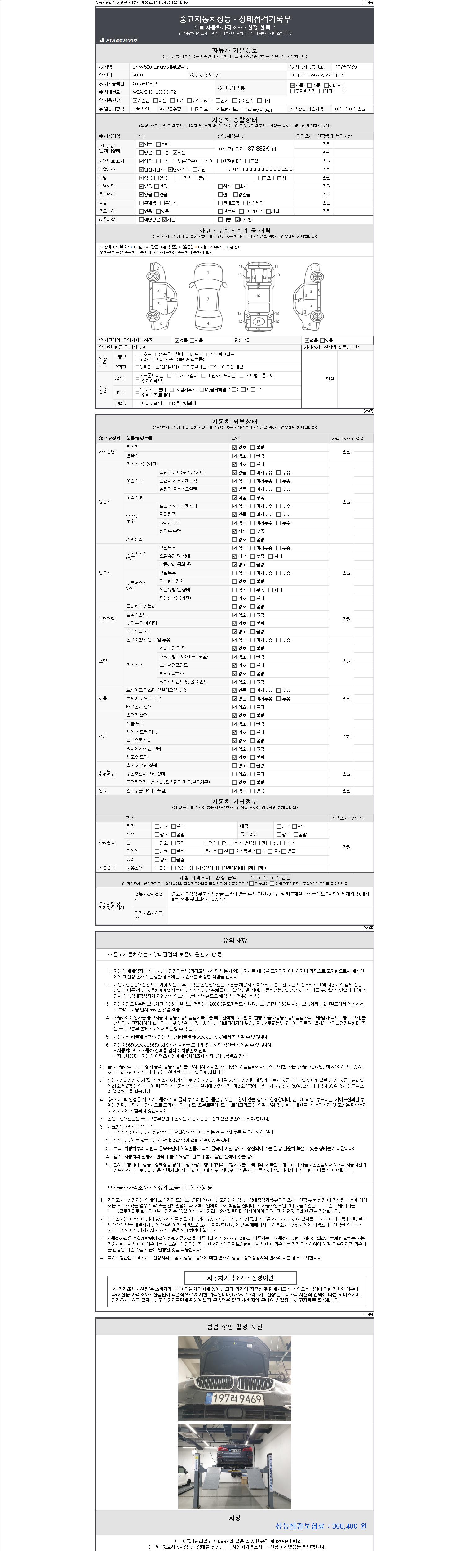 자동차관리법 시행규칙 제120조의 규정에 따라 별지 제 82호서식 《중고자동차 성능, 상태점검 기록부》를 발행한 성능, 상태점검자 및 매매자는 아래의 보증기간 또는 보증거리 이내의 중고자동차, 성능점검 기록부에 기재된 내용과 자동차의 실제 성능, 상태가 다른 경우 계약 또는 관계법령에 따라 매수인에 대하여 책임을 집니다.