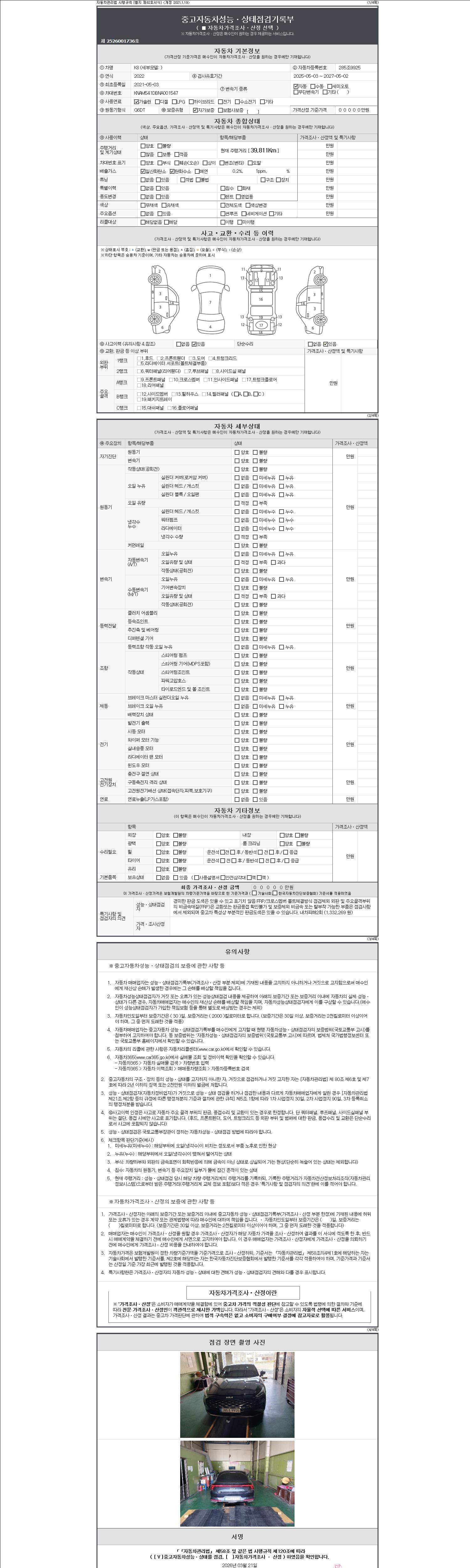 자동차관리법 시행규칙 제120조의 규정에 따라 별지 제 82호서식 《중고자동차 성능, 상태점검 기록부》를 발행한 성능, 상태점검자 및 매매자는 아래의 보증기간 또는 보증거리 이내의 중고자동차, 성능점검 기록부에 기재된 내용과 자동차의 실제 성능, 상태가 다른 경우 계약 또는 관계법령에 따라 매수인에 대하여 책임을 집니다.