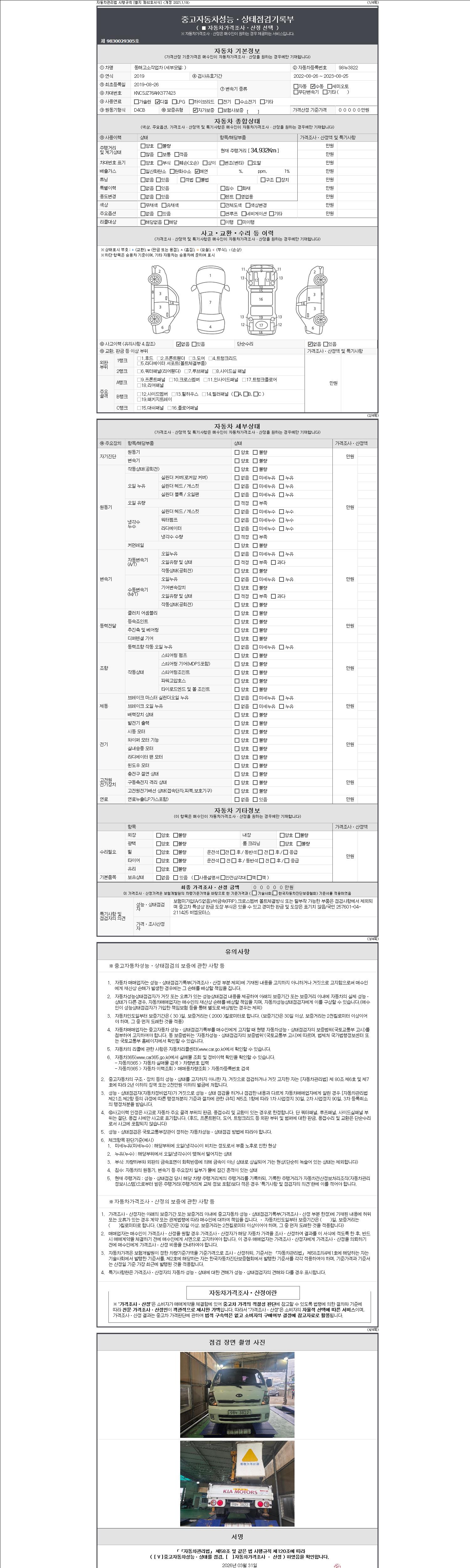 자동차관리법 시행규칙 제120조의 규정에 따라 별지 제 82호서식 《중고자동차 성능, 상태점검 기록부》를 발행한 성능, 상태점검자 및 매매자는 아래의 보증기간 또는 보증거리 이내의 중고자동차, 성능점검 기록부에 기재된 내용과 자동차의 실제 성능, 상태가 다른 경우 계약 또는 관계법령에 따라 매수인에 대하여 책임을 집니다.
