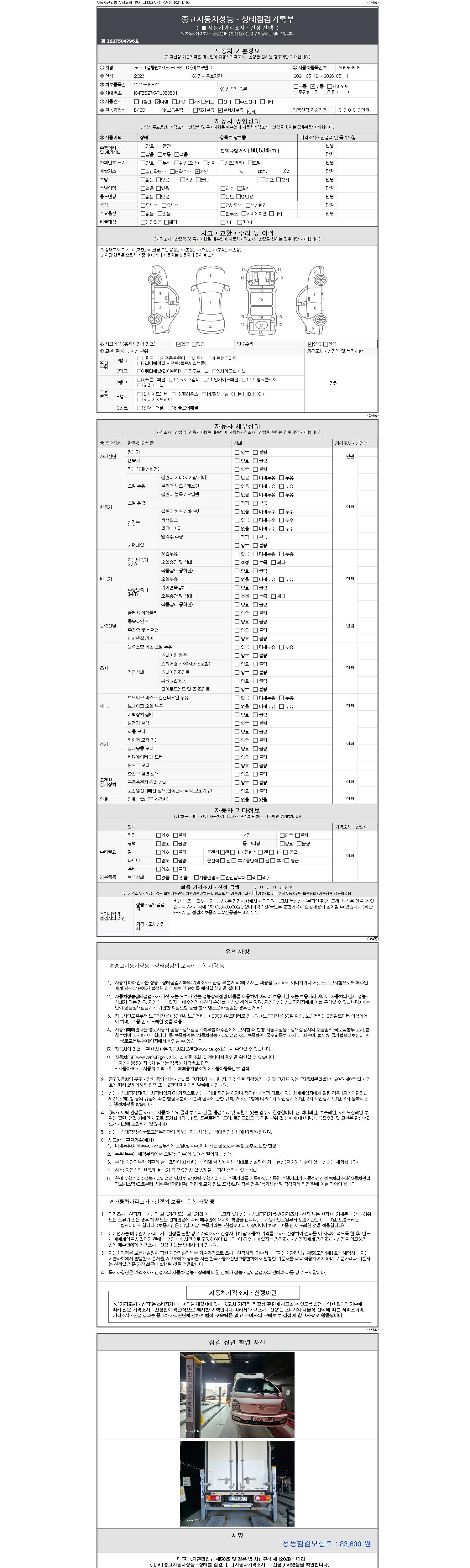 자동차관리법 시행규칙 제120조의 규정에 따라 별지 제 82호서식 《중고자동차 성능, 상태점검 기록부》를 발행한 성능, 상태점검자 및 매매자는 아래의 보증기간 또는 보증거리 이내의 중고자동차, 성능점검 기록부에 기재된 내용과 자동차의 실제 성능, 상태가 다른 경우 계약 또는 관계법령에 따라 매수인에 대하여 책임을 집니다.