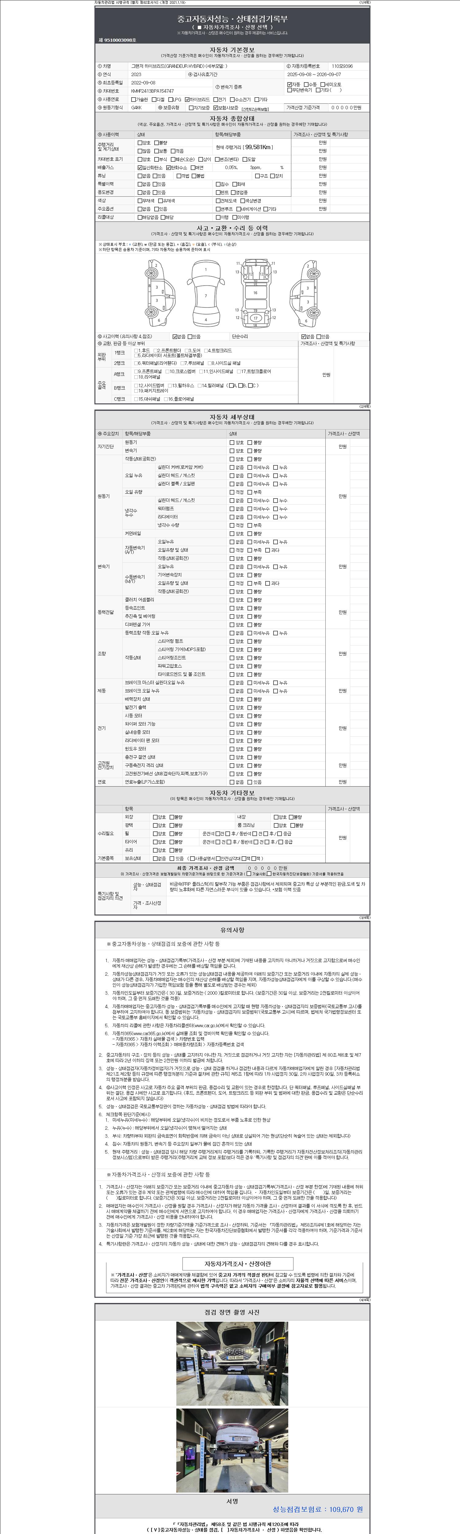 자동차관리법 시행규칙 제120조의 규정에 따라 별지 제 82호서식 《중고자동차 성능, 상태점검 기록부》를 발행한 성능, 상태점검자 및 매매자는 아래의 보증기간 또는 보증거리 이내의 중고자동차, 성능점검 기록부에 기재된 내용과 자동차의 실제 성능, 상태가 다른 경우 계약 또는 관계법령에 따라 매수인에 대하여 책임을 집니다.