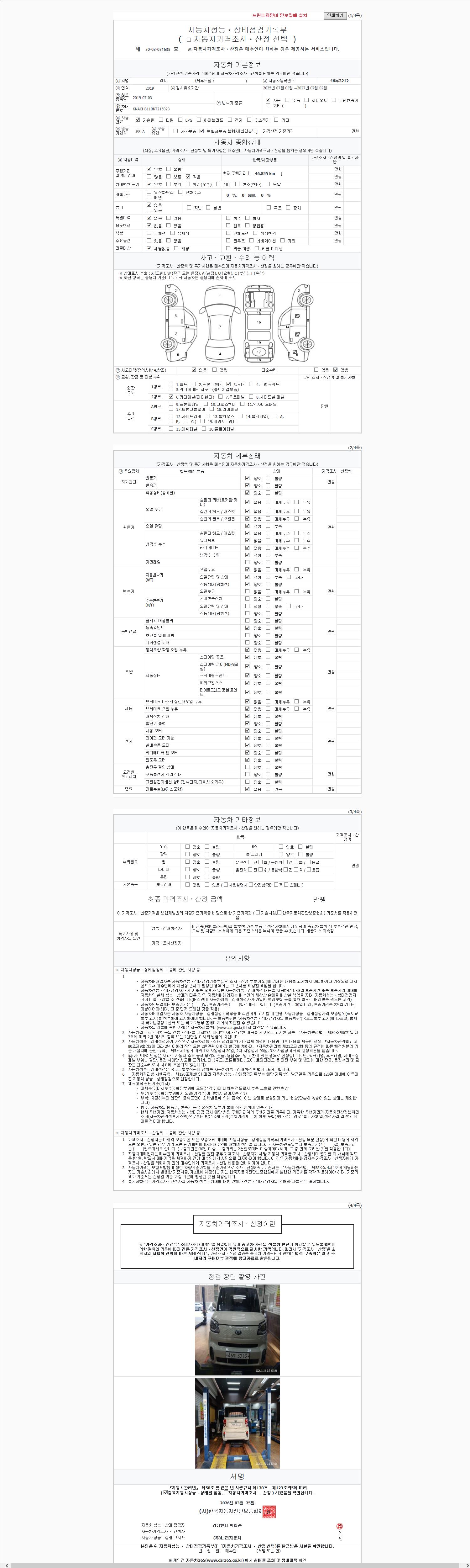 | 주행거리 | 46,855 km | 차량번호 | 46부3212 | 사고유무 | 성능기록부 참조 | 제시번호 | 제 2026034918 호 |