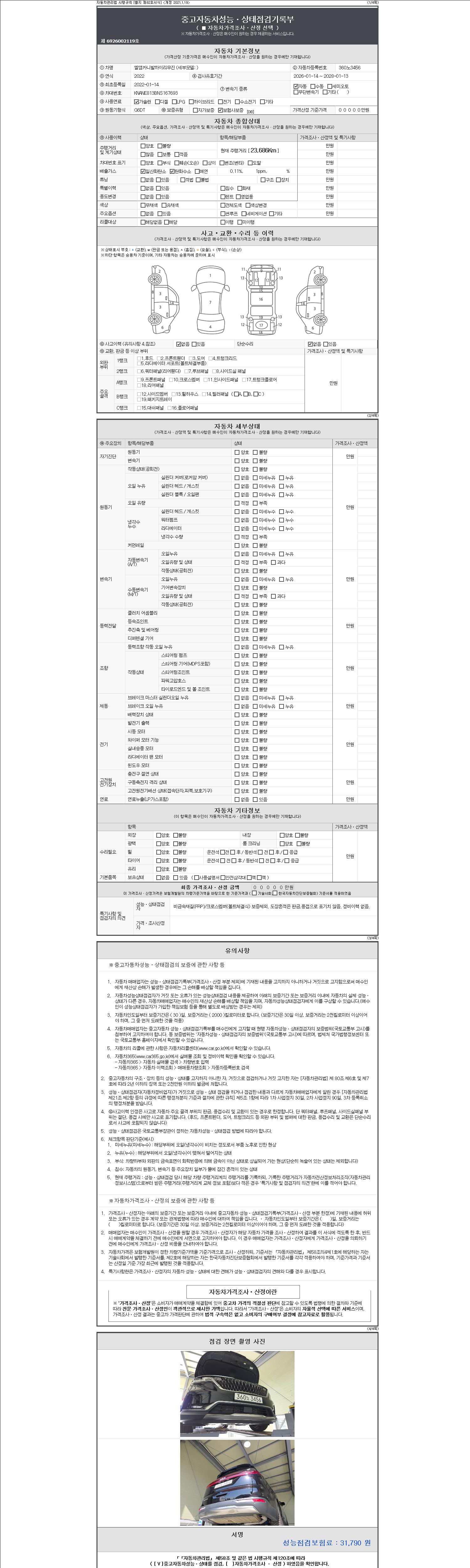 | 주행거리 | 23,686 km | 차량번호 | 360노3456 | 사고유무 | 성능기록부 참조 | 제시번호 | 제 2147483647 호 |