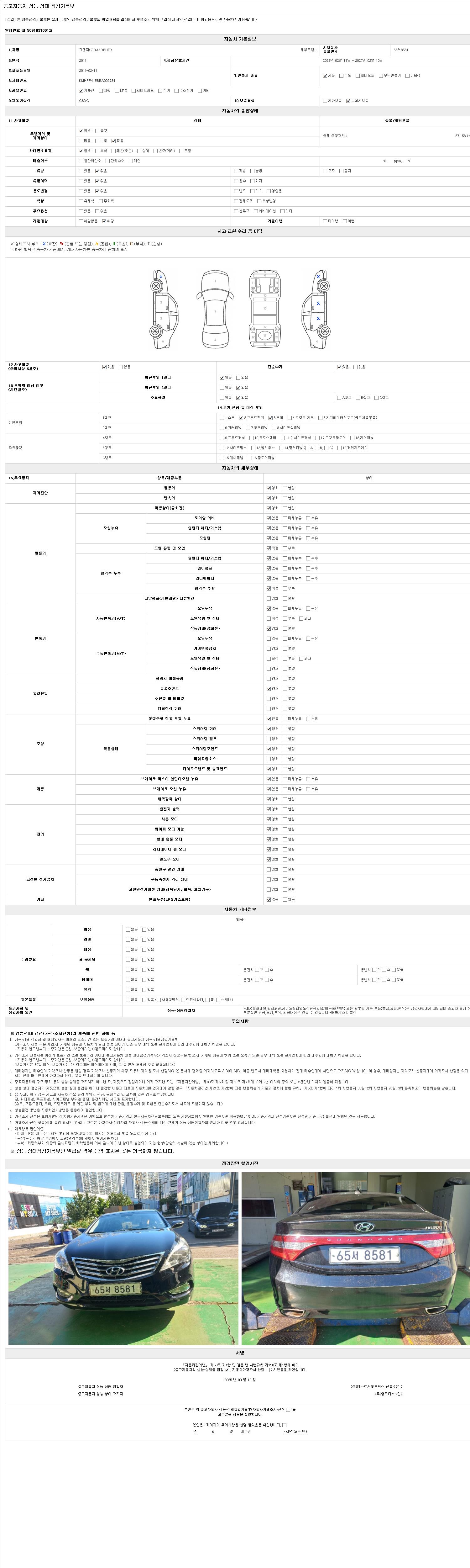 | 주행거리 | 87,158 km | 차량번호 | 65서8581 | 사고유무 | 성능기록부 참조 | 제시번호 | 제 2025029936 호 |