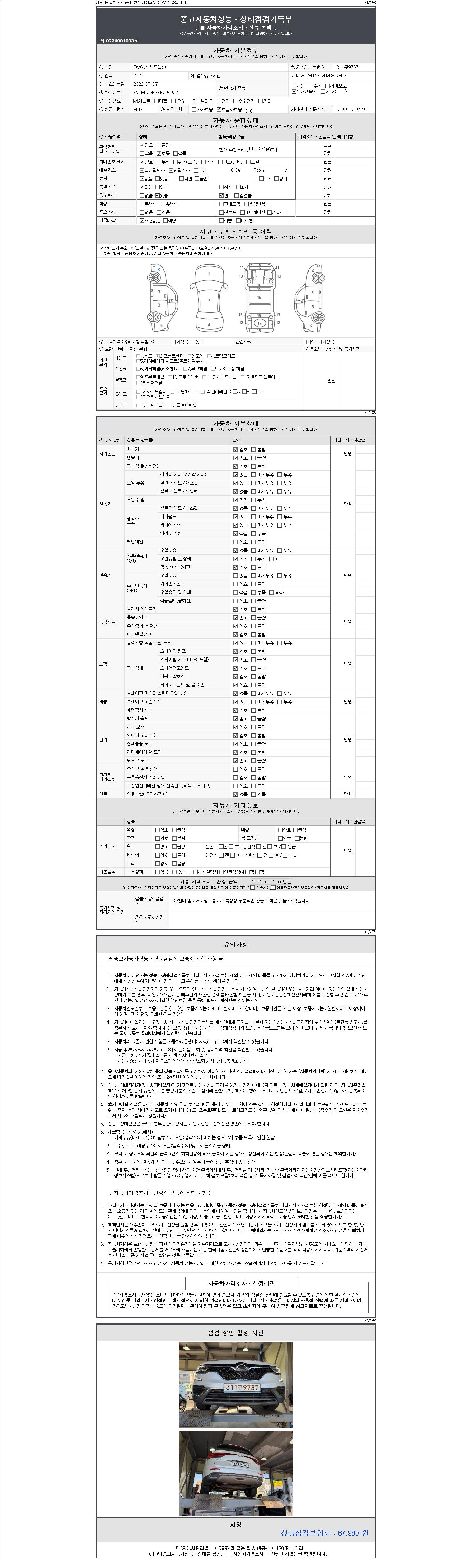 | 주행거리 | 55,370 km | 차량번호 | 311구9737 | 사고유무 | 성능기록부 참조 | 제시번호 | 제 2147483647 호 |