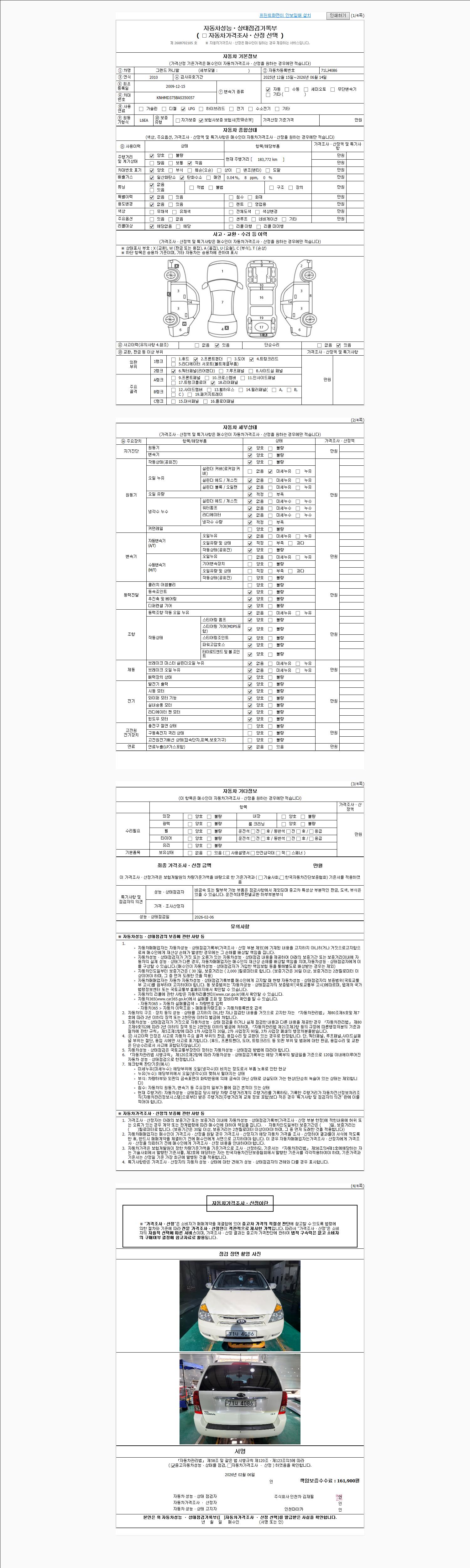 | 주행거리 | 183,760 km | 차량번호 | 71나4086 | 사고유무 | 성능기록부 참조 | 제시번호 | 제 2026005438 호 |