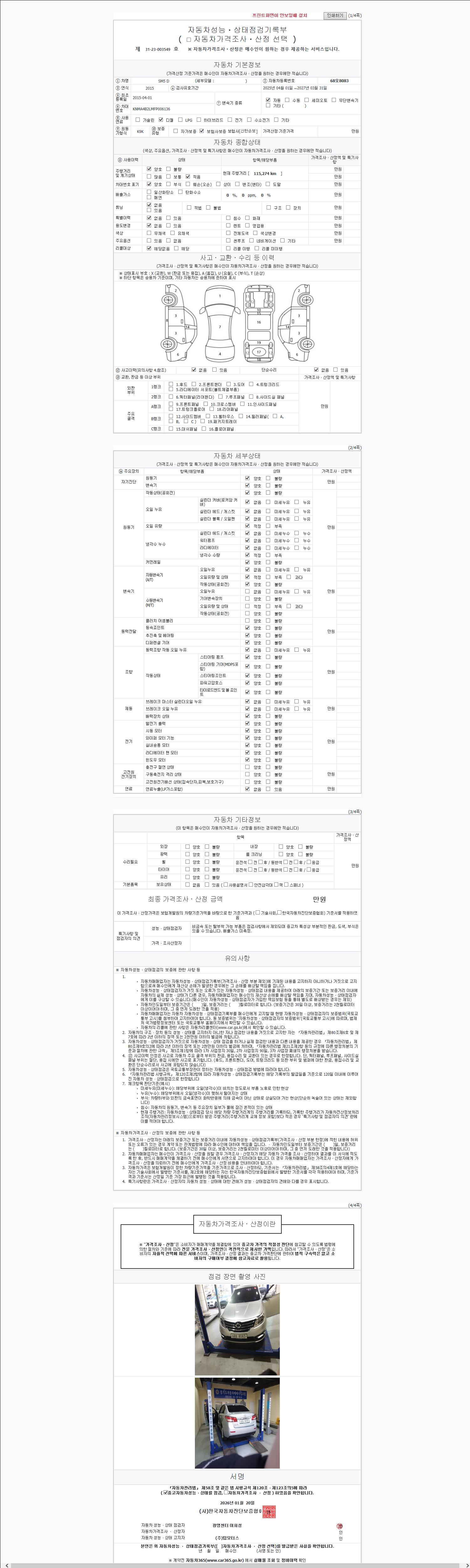 | 주행거리 | 115,273 km | 차량번호 | 68오8083 | 사고유무 | 성능기록부 참조 | 제시번호 | 제 2147483647 호 |