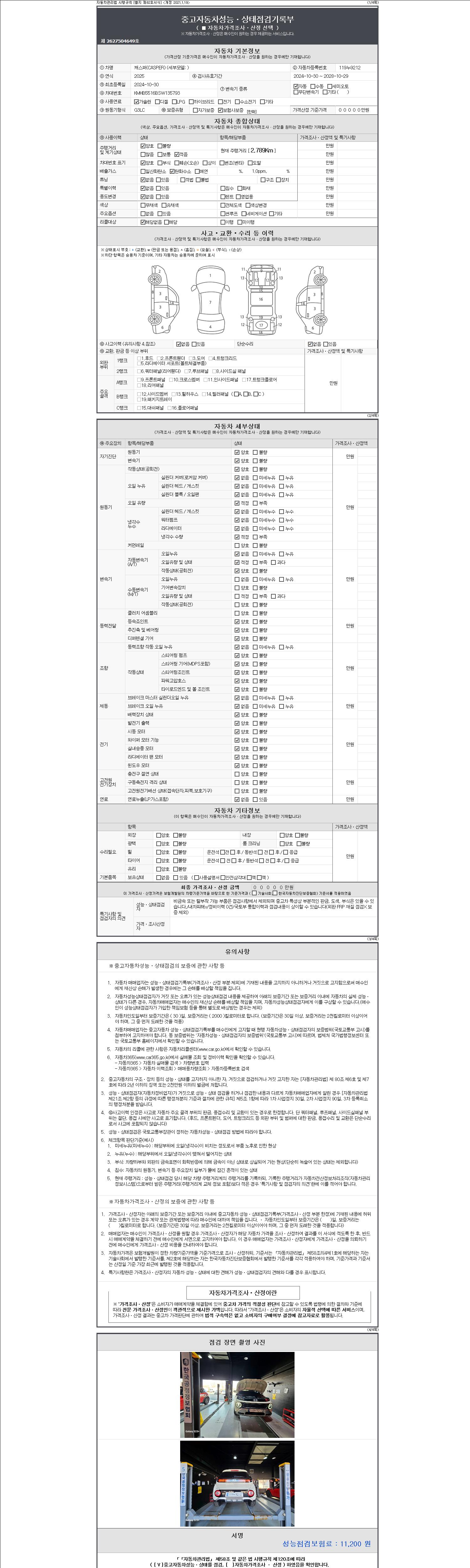 자동차관리법 시행규칙 제120조의 규정에 따라 별지 제 82호서식 《중고자동차 성능, 상태점검 기록부》를 발행한 성능, 상태점검자 및 매매자는 아래의 보증기간 또는 보증거리 이내의 중고자동차, 성능점검 기록부에 기재된 내용과 자동차의 실제 성능, 상태가 다른 경우 계약 또는 관계법령에 따라 매수인에 대하여 책임을 집니다.