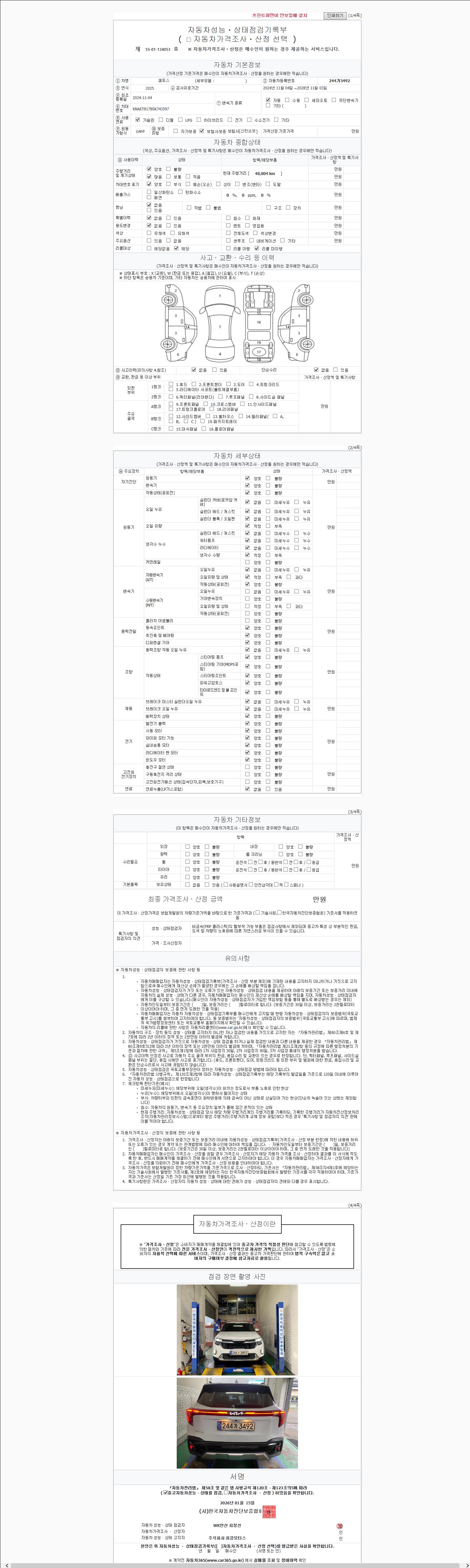 | 주행거리 | 48,004 km | 차량번호 | 244가3492 | 사고유무 | 성능기록부 참조 | 제시번호 | 제 2147483647 호 |