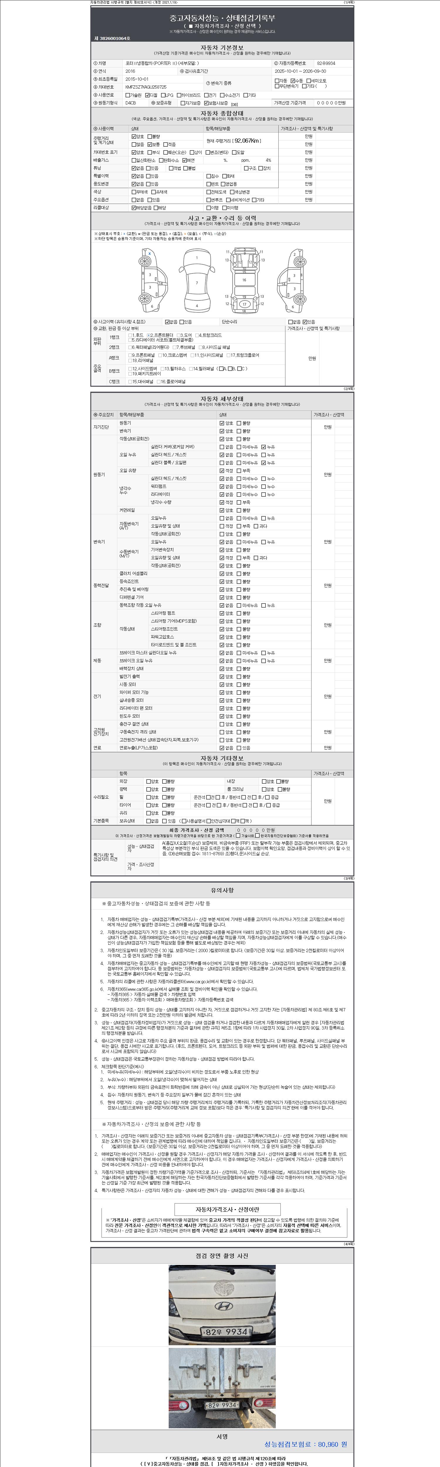 | 주행거리 | 92,067 km | 차량번호 | 82우9934 | 사고유무 | 성능기록부 참조 | 제시번호 | 제 2147483647 호 |