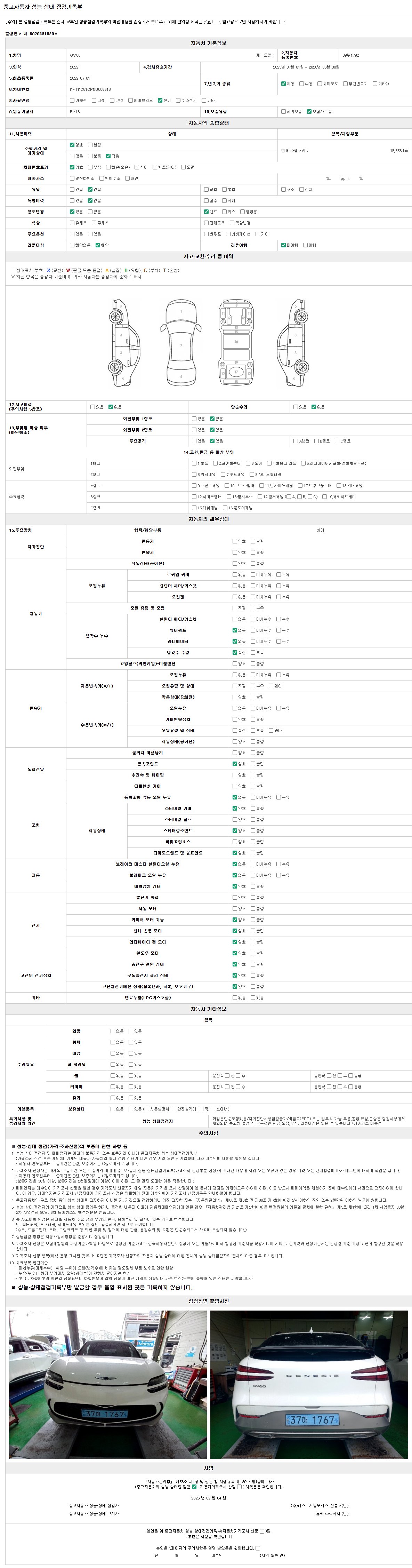 | 주행거리 | 15,553 km | 차량번호 | 09누1792 | 사고유무 | 성능기록부 참조 | 제시번호 | 제 2026003855 호 |