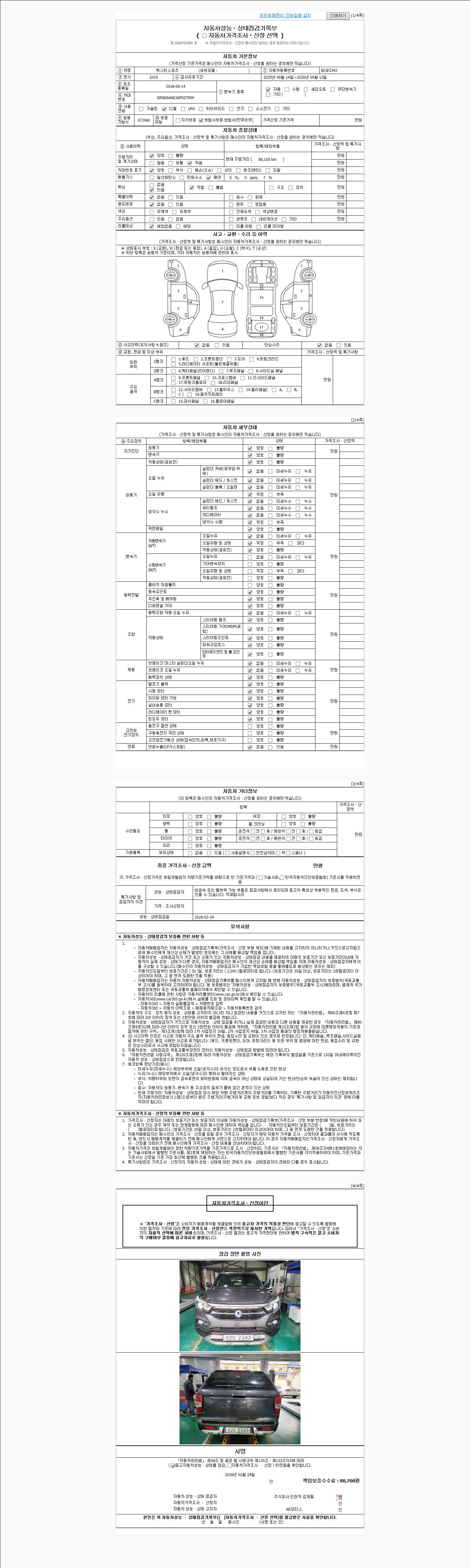 | 주행거리 | 86,105 km | 차량번호 | 82보2343 | 사고유무 | 성능기록부 참조 | 제시번호 | 제 2026008648 호 |