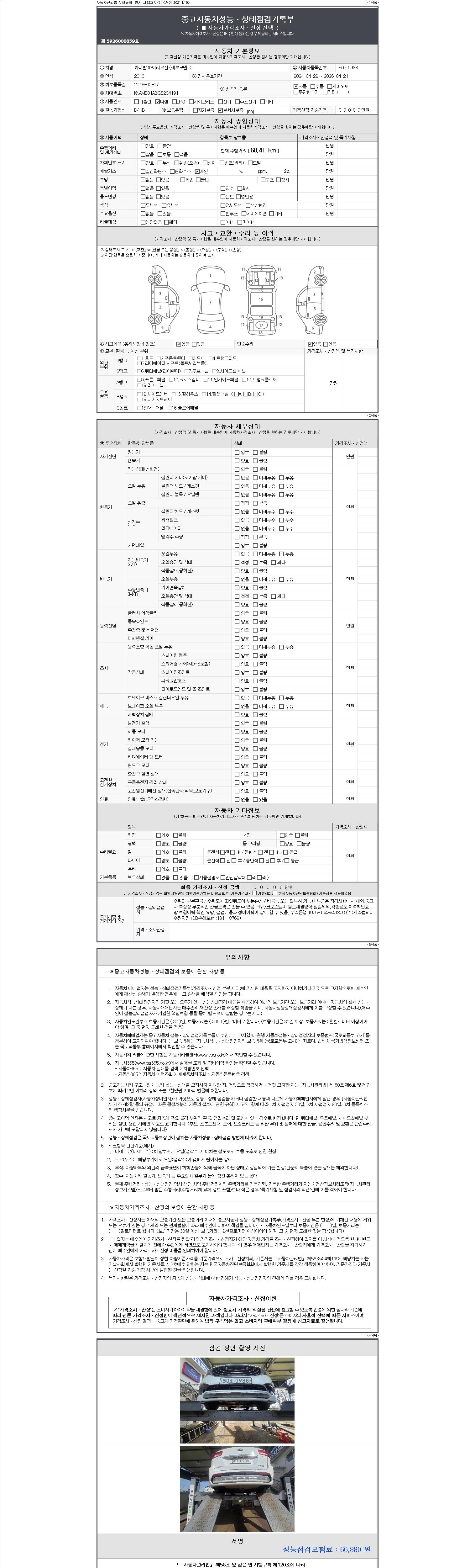 | 주행거리 | 68,411 km | 차량번호 | 50소0988 | 사고유무 | 성능기록부 참조 | 제시번호 | 제 2147483647 호 |