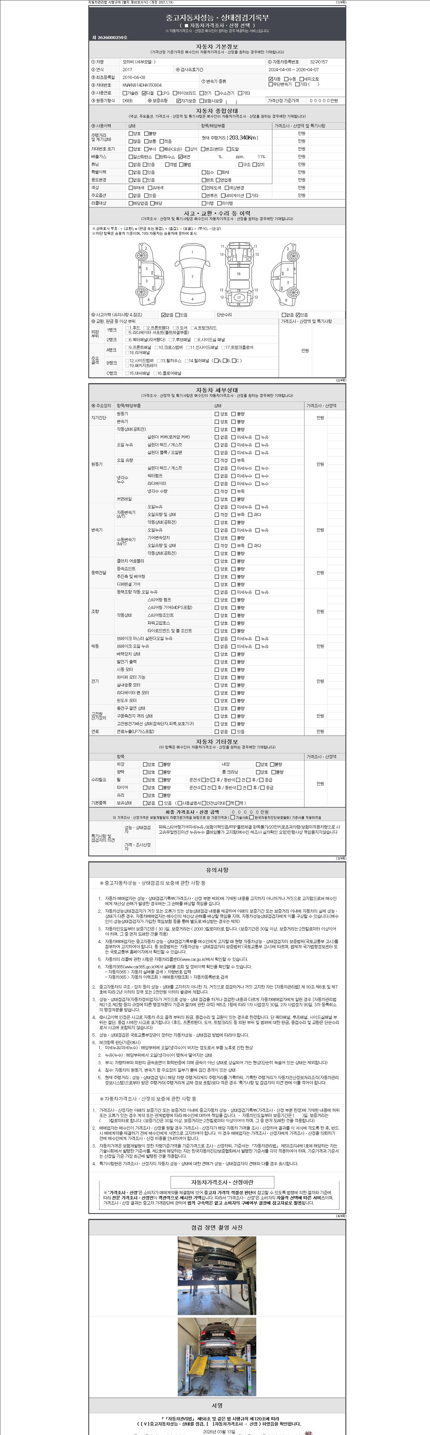 자동차관리법 시행규칙 제120조의 규정에 따라 별지 제 82호서식 《중고자동차 성능, 상태점검 기록부》를 발행한 성능, 상태점검자 및 매매자는 아래의 보증기간 또는 보증거리 이내의 중고자동차, 성능점검 기록부에 기재된 내용과 자동차의 실제 성능, 상태가 다른 경우 계약 또는 관계법령에 따라 매수인에 대하여 책임을 집니다.