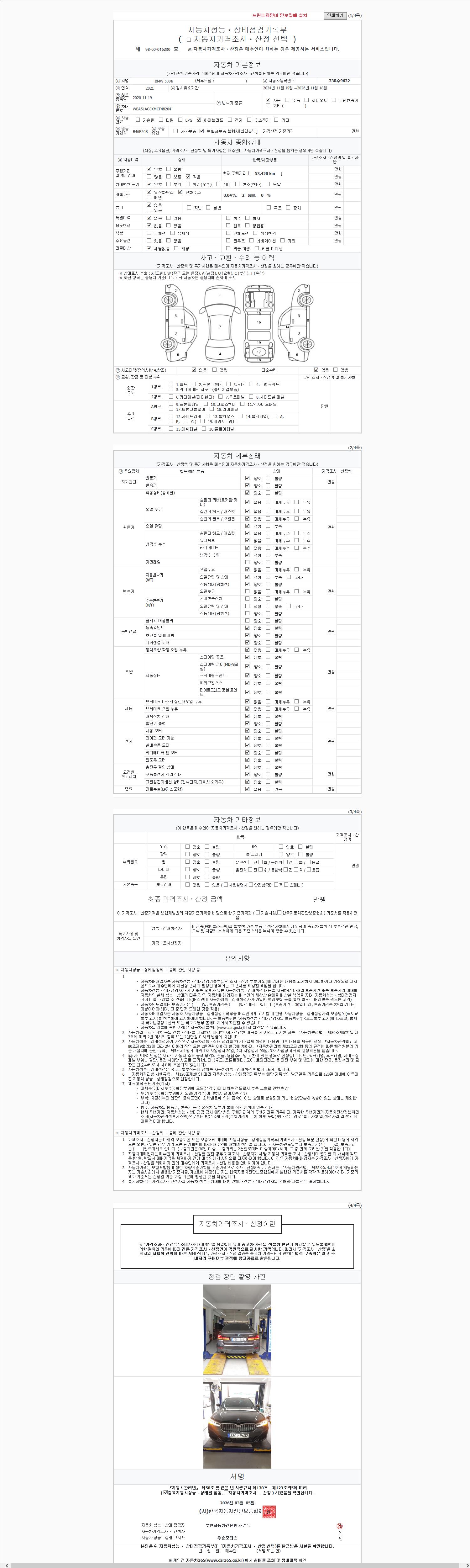 | 주행거리 | 53,396 km | 차량번호 | 330수9632 | 사고유무 | 성능기록부 참조 | 제시번호 | 제 2026041414 호 |