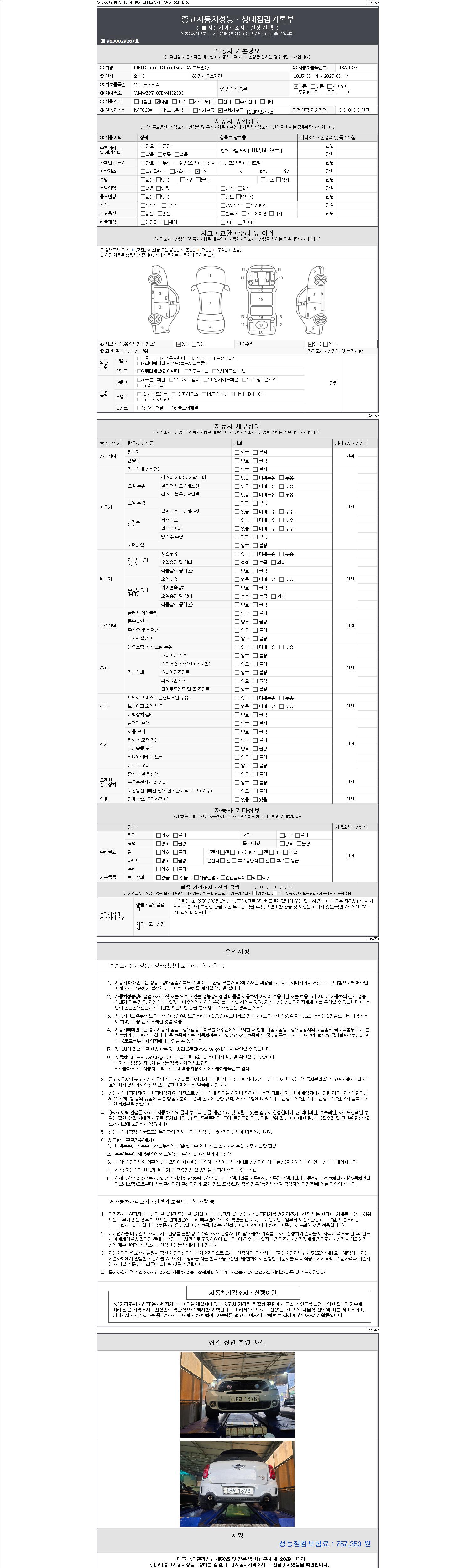 -중고자동차 매매업자를 통해 차량을 구입하실 경우 반드시 "중고자동차 성능, 상태점검 기록부"를 교뷰 받으셔야 하며, 매매업자는 반드시 의무 교부 하여야 압니다.