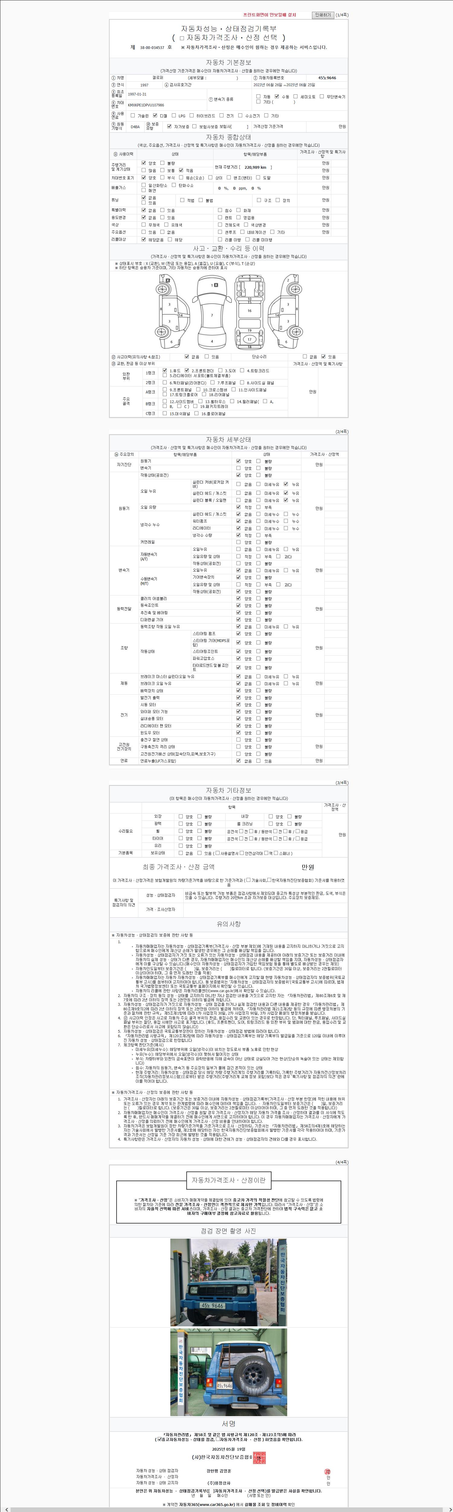 | 주행거리 | 220,989 km | 차량번호 | 45노9646 | 사고유무 | 성능기록부 참조 | 제시번호 | 제 2147483647 호 |