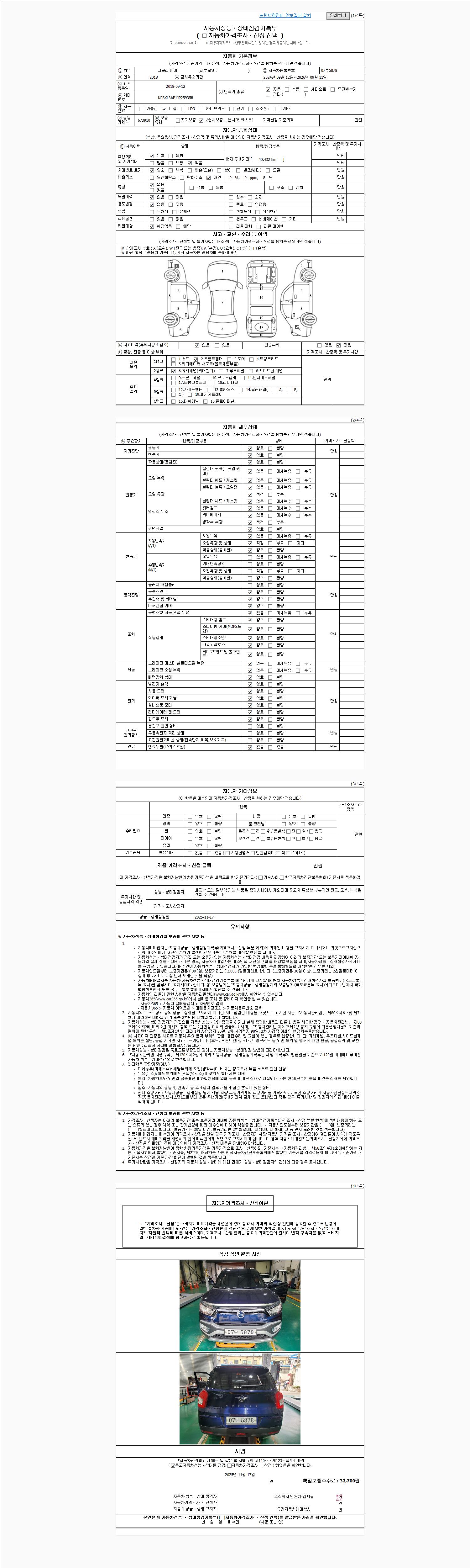 자동차관리법 시행규칙 제120조의 규정에 따라 별지 제 82호서식 《중고자동차 성능, 상태점검 기록부》를 발행한 성능, 상태점검자 및 매매자는 아래의 보증기간 또는 보증거리 이내의 중고자동차, 성능점검 기록부에 기재된 내용과 자동차의 실제 성능, 상태가 다른 경우 계약 또는 관계법령에 따라 매수인에 대하여 책임을 집니다.