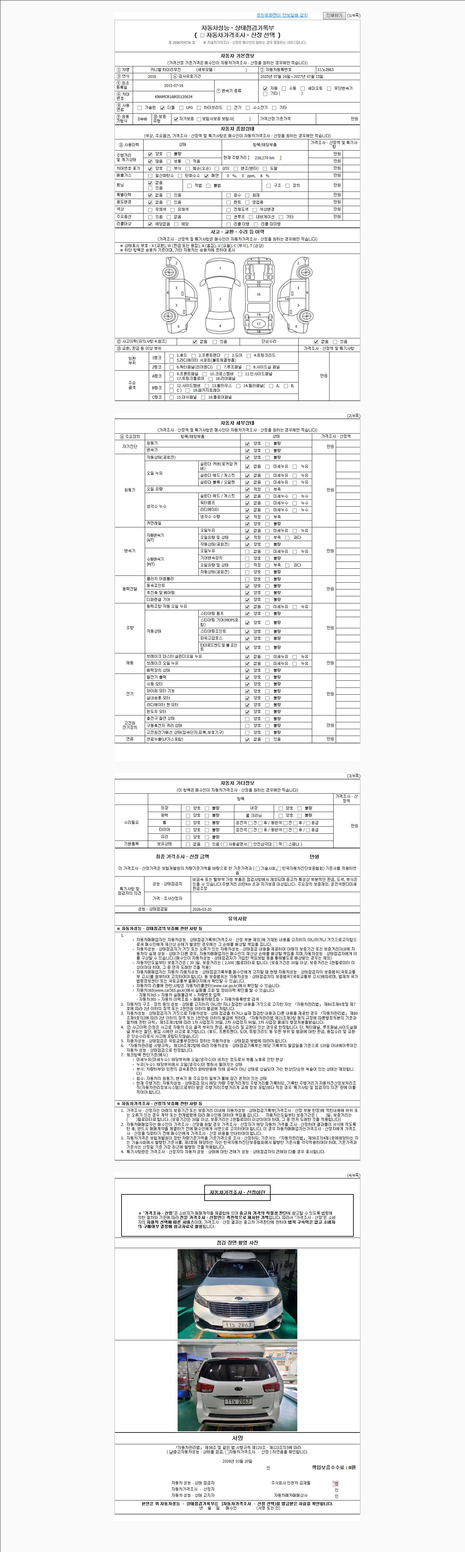 | 주행거리 | 215,001 km | 차량번호 | 11노2863 | 사고유무 | 성능기록부 참조 | 제시번호 | 제 2026002176 호 |