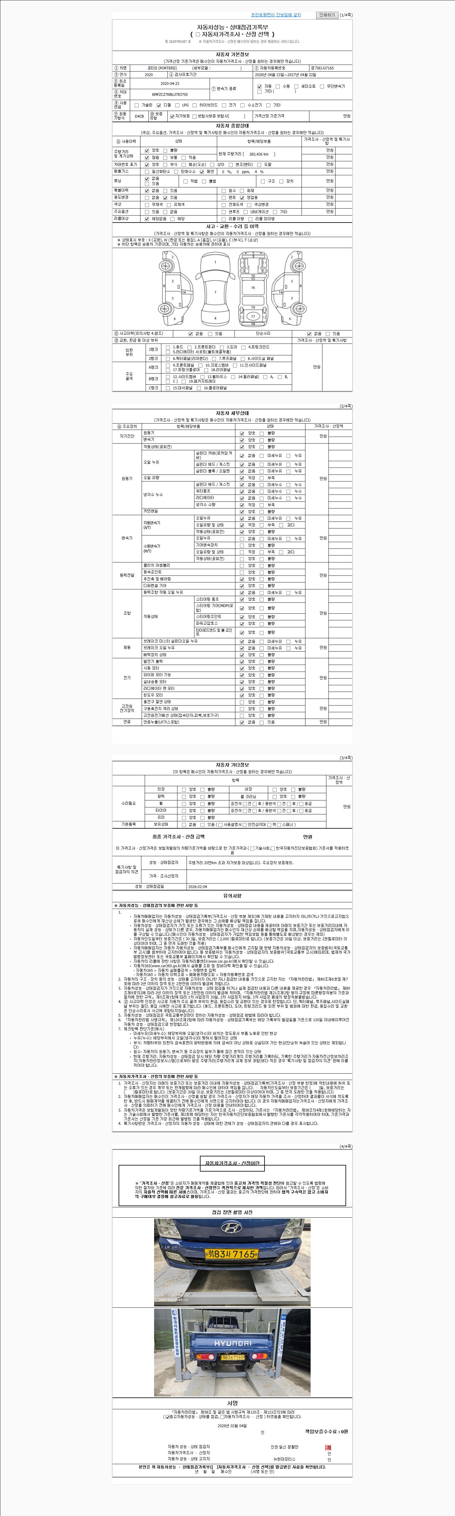 | 주행거리 | 380,000 km | 차량번호 | 경기83사7165 | 사고유무 | 성능기록부 참조 | 제시번호 | 제 2026005722 호 |