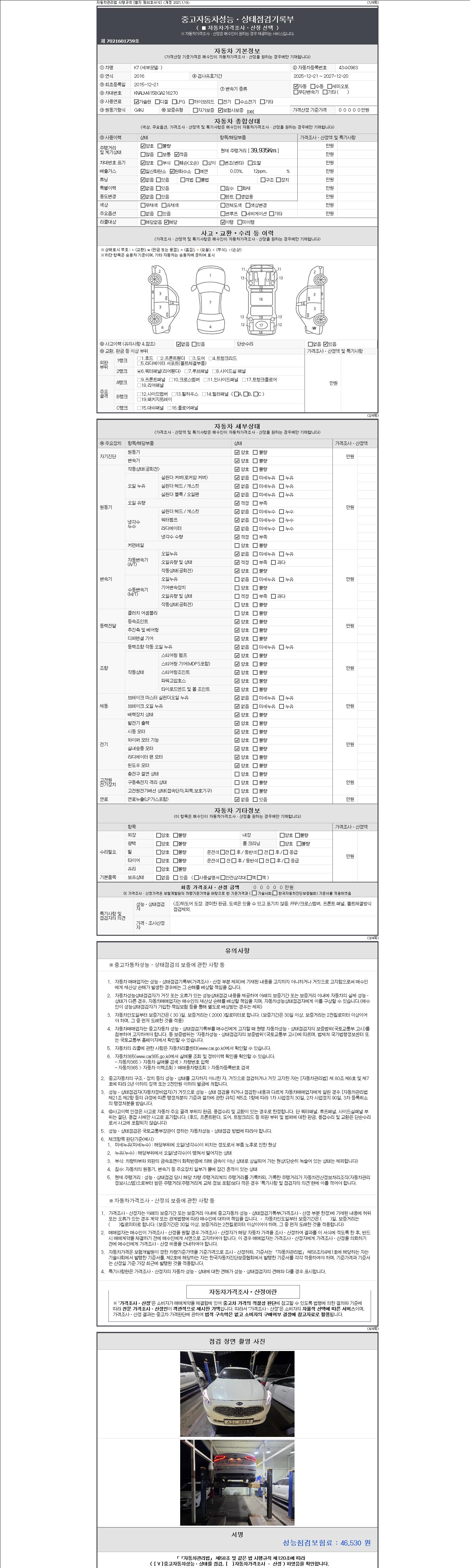 자동차관리법 시행규칙 제120조의 규정에 따라 별지 제 82호서식 《중고자동차 성능, 상태점검 기록부》를 발행한 성능, 상태점검자 및 매매자는 아래의 보증기간 또는 보증거리 이내의 중고자동차, 성능점검 기록부에 기재된 내용과 자동차의 실제 성능, 상태가 다른 경우 계약 또는 관계법령에 따라 매수인에 대하여 책임을 집니다.
