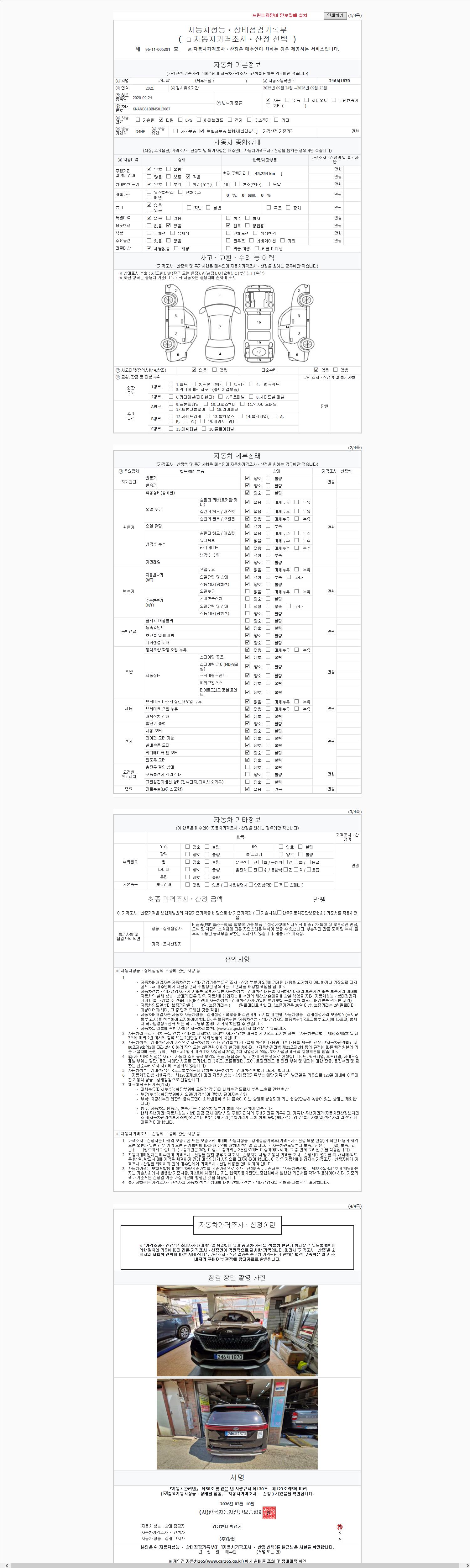 | 주행거리 | 45,254 km | 차량번호 | 246서1870 | 사고유무 | 성능기록부 참조 | 제시번호 | 제 2026030935 호 |