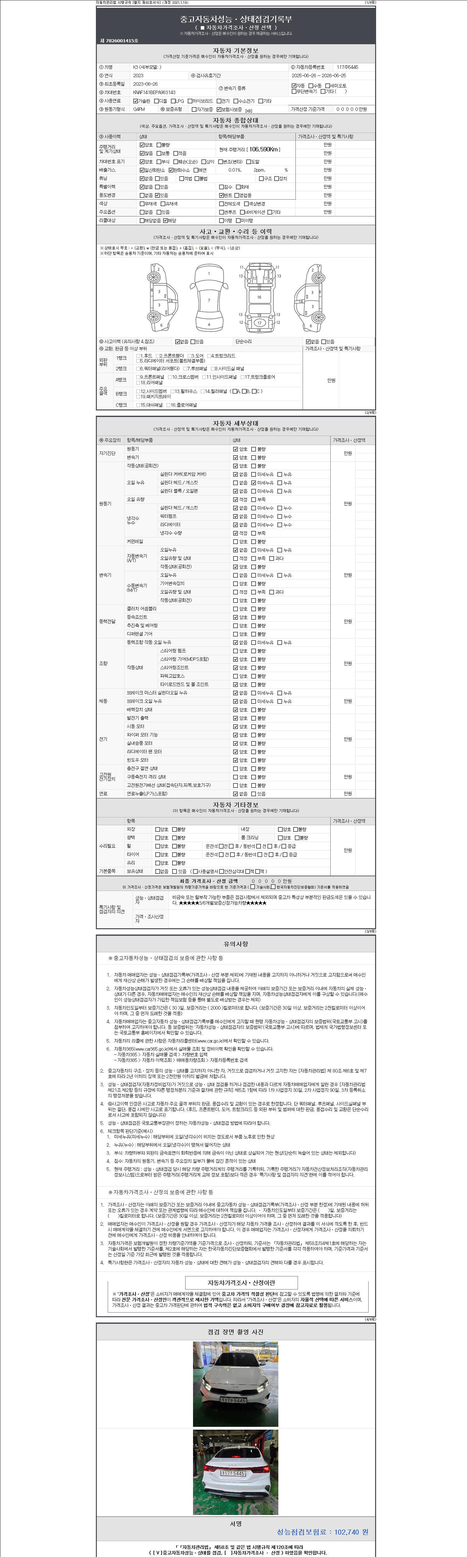 | 주행거리 | 106,590 km | 차량번호 | 117주5445 | 사고유무 | 성능기록부 참조 | 제시번호 | 제 2147483647 호 |