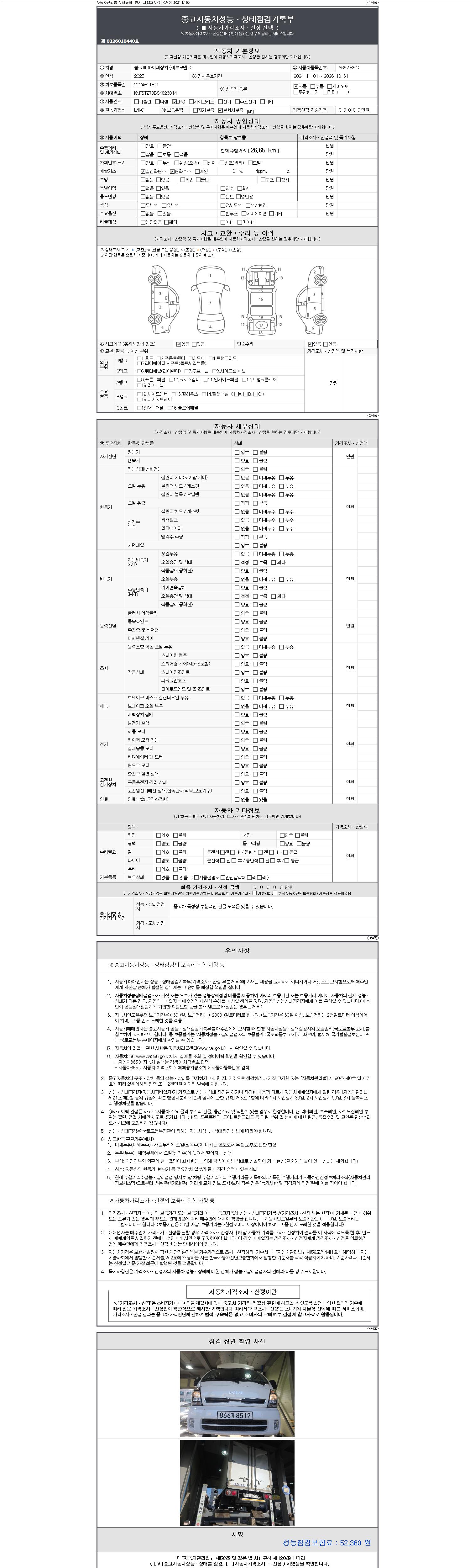| 주행거리 | 26,651 km | 차량번호 | 866가8512 | 사고유무 | 성능기록부 참조 | 제시번호 | 제 2147483647 호 |