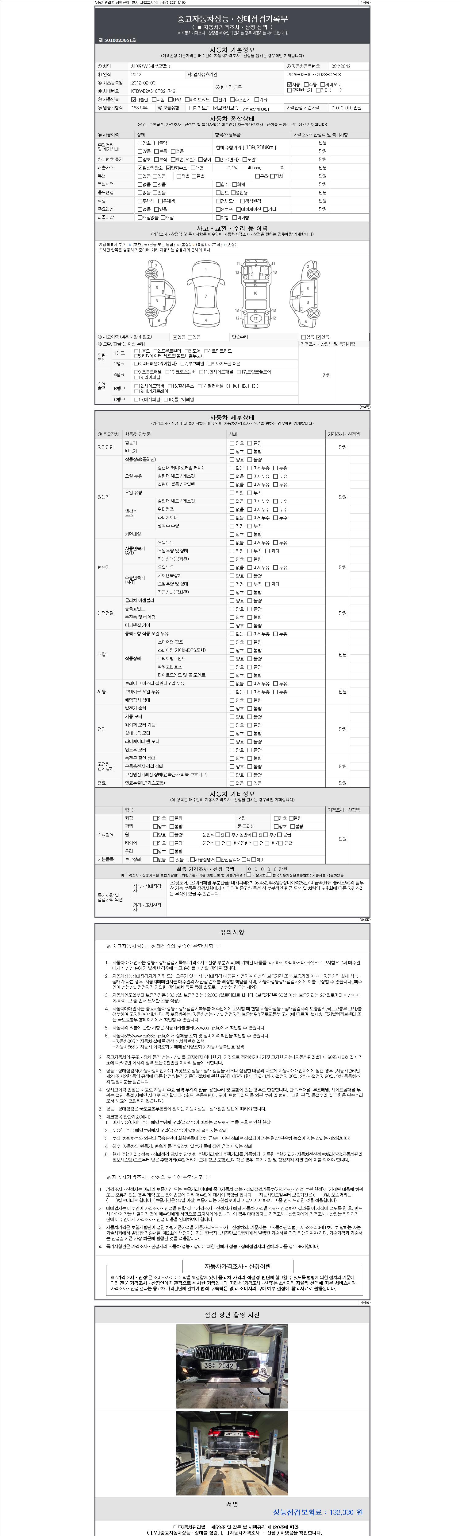 -중고자동차 매매업자를 통해 차량을 구입하실 경우 반드시 "중고자동차 성능, 상태점검 기록부"를 교뷰 받으셔야 하며, 매매업자는 반드시 의무 교부 하여야 압니다.