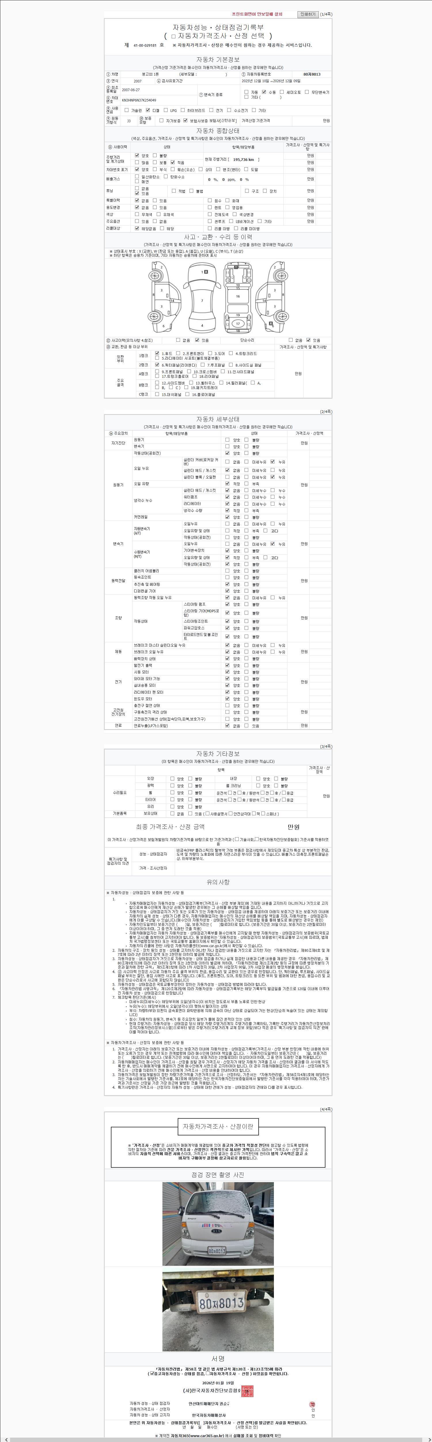 | 주행거리 | 195,736 km | 차량번호 | 80저8013 | 사고유무 | 성능기록부 참조 | 제시번호 | 제 2147483647 호 |
