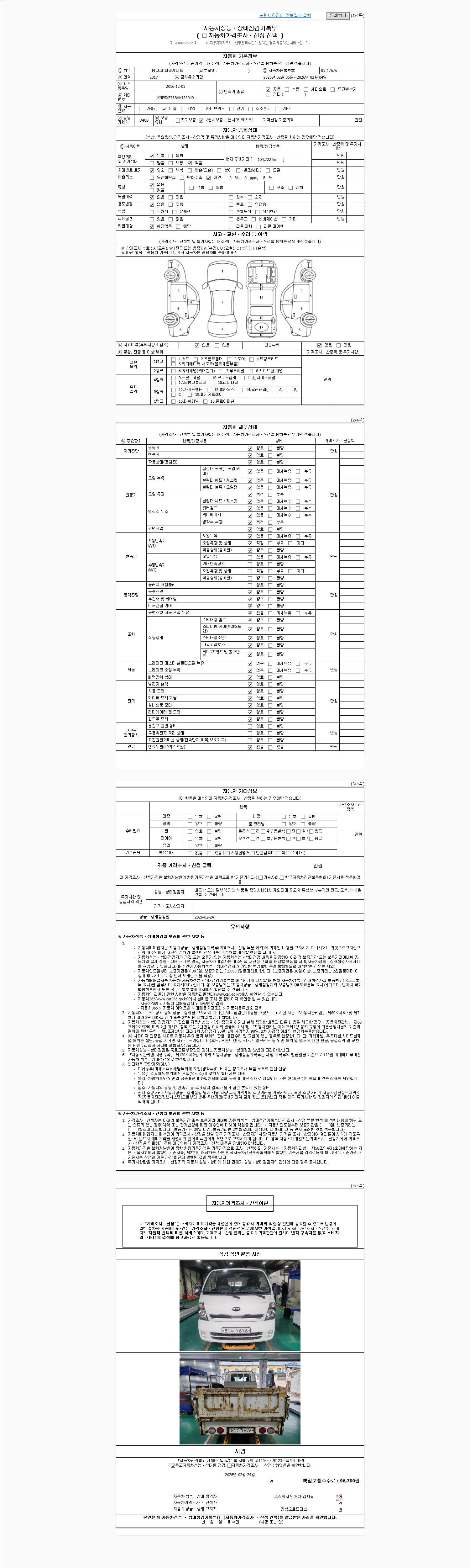 | 주행거리 | 104,722 km | 차량번호 | 81수7676 | 사고유무 | 성능기록부 참조 | 제시번호 | 제 2026008798 호 |