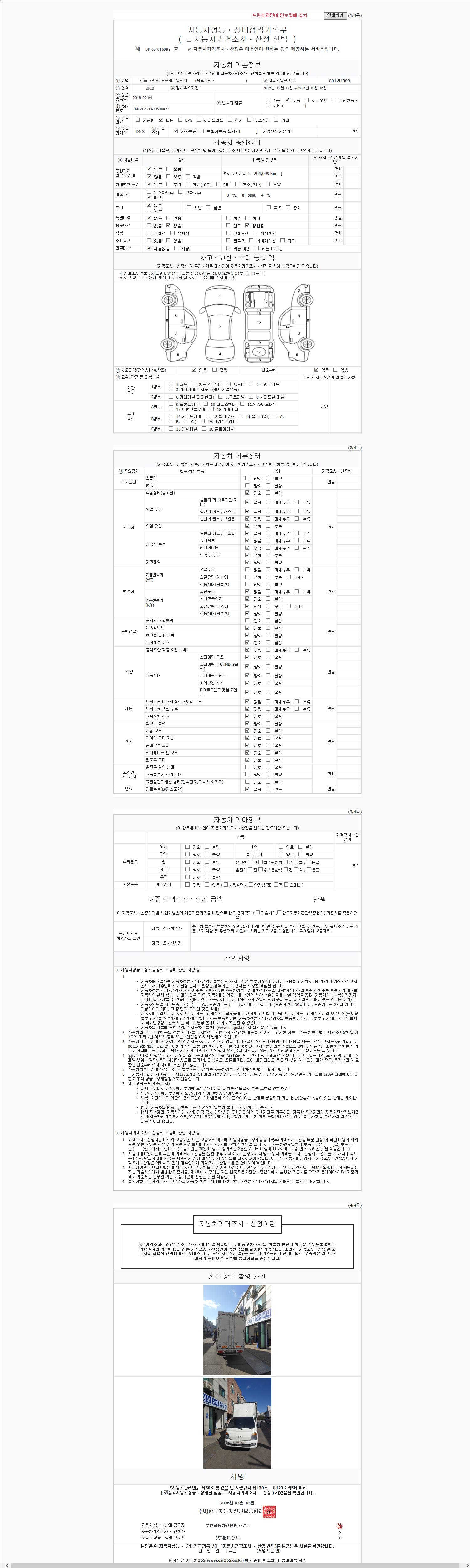 | 주행거리 | 204,099 km | 차량번호 | 801거4309 | 사고유무 | 성능기록부 참조 | 제시번호 | 제 2026031927 호 |